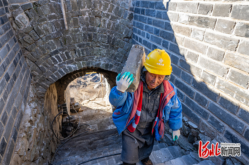 11月21日,工人将从长城周边收集来的砖块扛上墩台。