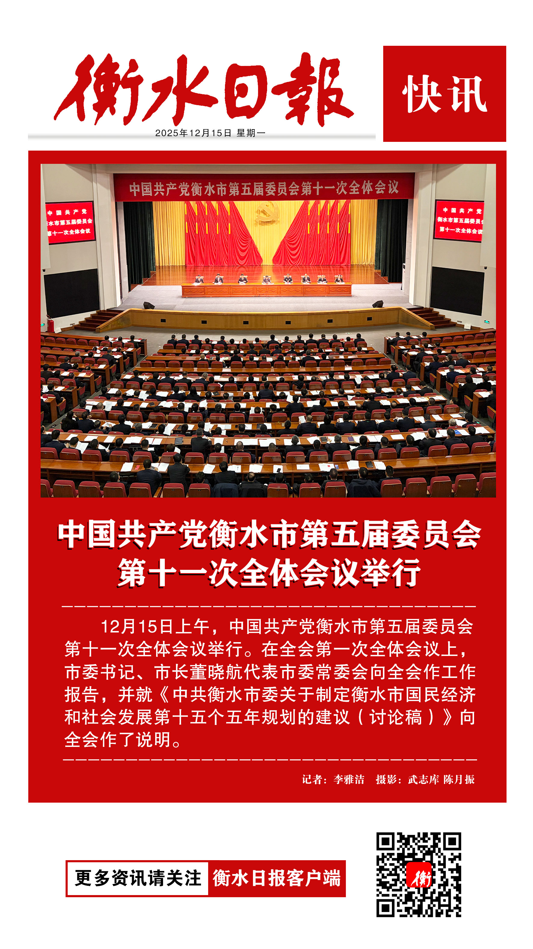点赞 +1 微博 微信 我要评论 发布 相关推荐 中共衡水日报社党委关于五届市委第十一轮巡察整改进展情况的通报 关注 13小时前 衡水市纪委五届六次全会召开 政情 02-07 中国共产党衡水市第五届纪律检查委员会第六次全体会议决议 政情 02-07 【一图解读】政协衡水市第七届委员会常务委员会工作报告→ 政情 02-04 中国共产党河北省第十届纪律检查委员会第六次全体会议决议 关注 01-31 建言献策担使命 同向同行谱新篇——政协河北省第十三届委员会2025年工作综述 关注 01-25 中国共产党第二十届中央纪律检查委员会第五次全体会议公报 要闻 01-15 热门 一天 三天 一周 1 中共衡水日报社党委关于五届市委第十一轮巡察整改进展情况的通报 2 衡水市区“网红”杜梨树盛放 市民忙打卡 3 衡水湖樱花岛迎来赏樱热潮 4 穿跑步提分“神器”体测能拿高分? 衡水四院专家提醒:少年儿童穿碳板鞋需守好健康底线 5 衡水前进大街:碧桃盛放 灿若云霞 6 衡水供销社测土配肥让冬小麦返青拔节底气足 7 【暖新闻】货车抛锚鲜菜被闷车内 衡水“高速人”暖心护航化解司机燃眉之急 8 衡水市图书馆:文化下沉进社区 童心绘梦话清明 9 【文明旅游反面曝光】文明露营 共护春日美景 10 【家国永念】习言道|新时代是需要英雄并一定能够产生英雄的时代 1 【网络中国节·清明】85载回响 太行仍念放牛郎 2 优良家风共传承 移风易俗润清明 衡水市景县苏老家村举办第二届家风季活动 3 【专题海报】清明祭英烈 4 中共衡水日报社党委关于五届市委第十一轮巡察整改进展情况的通报 5 央媒省媒关注青头潜鸭在衡水湖野化放飞 6 衡水市公安局组织开展清明主题致敬活动 7 海报系列||早安衡水 8 插画视频丨梨花落,燕归来,正是清明好春光 9 家国永念|山河铭记 10 值班总编说报|春韵承初心 实干铸华章 1 五大调整 衡水2026年消费品以旧换新政策有新变化 2 一场仪式 一堂党课 一次洗礼 武邑县举行清明节祭扫活动 3 春风送岗 戎耀湖城 衡水市举办2026年退役军人军属春季专场招聘会 4 衡水90余家外贸企业赴阿里巴巴跨境电商基地“充电” 5 全球首次 12只自然繁育野化青头潜鸭在衡水湖放飞 6 【衡视频】15万公斤西红柿滞销 枣强种植户急盼销路 7 衡水杨柳絮预报地图出炉 8 【褒扬诚信典型】衡水大学生拾金不昧 捡到万元手机物归原主 9 簇簇蓝莓“链”京津 ——冀州区以科技赋能现代农业高质量发展见闻 10 把“关键小事”办成“暖心实事”——衡水打出“组合拳”让校园周边“有颜”又“有序” 广告 广告 广告 24小时 1 天天学习|“1”心系万家 2 习近平致电祝贺苏林当选越南国家主席 3 影像河北丨春到雄安看新景 4 对话 在雄安丨从台湾到雄安:他看准了这座未来之城的烟火气 5 “河北福嫂”进京津 6 打造“好房子” 让疏解人员安家又安心 7 清明假期盘点 雄安新区 郊野公园踏青热 假期接待游客近12万人次 8 京津冀社保经办服务达成多项合作 9 “我还没打电话报修,你们就赶过来了!” 10 习近平总书记在雄安新区考察时的重要讲话,激励河北干部群众感恩奋进、真抓实干
