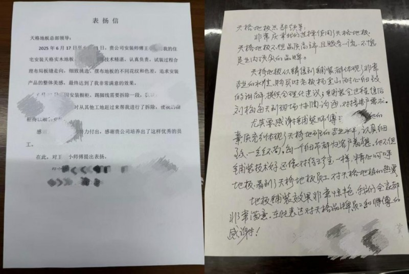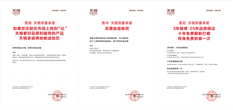 前面说的地板是“半成品”所以安装很重要;另一方面,地板还是耐用消费品,一铺几年十几年甚至几十年都不会更换。这么长的使用周期里面,怎么保证售后维护的落地执行?这就要说到地板行业的售后保障情况了。国标规定,地板的保修期为1年,而天格在2018年就推出两年保修,2024年再次延长至三年。在2020年,天格推出涵盖售前、售中、售后消费全链路的“五大承诺”,让用户真正实现“一次消费,终身受益”。