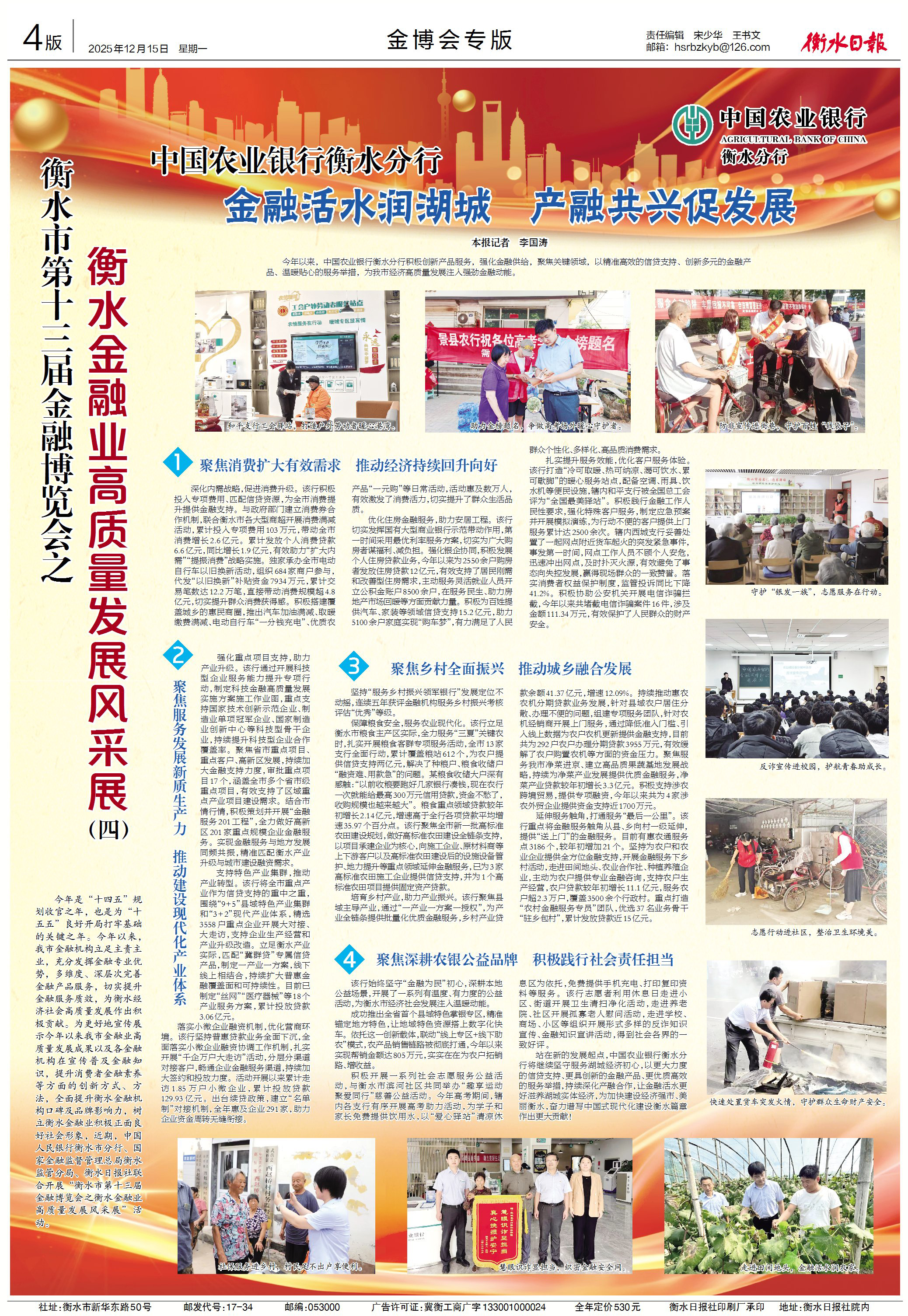 深化内需战略,促进消费升级。该行积极投入专项费用、匹配信贷资源,为全市消费提升提供金融支持。与政府部门建立消费券合作机制,联合衡水市各大型商超开展消费满减活动,累计投入专项费用103万元,带动全市消费增长2.6亿元。累计发放个人消费贷款6.6亿元,同比增长1.9亿元,有效助力“扩大内需”“提振消费”战略实施。独家承办全市电动自行车以旧换新活动,组织684家商户参与,代发“以旧换新”补贴资金7934万元,累计交易笔数达12.2万笔,直接带动消费规模超4.8亿元,切实提升群众消费获得感。积极搭建覆盖城乡的惠民商圈,推出汽车加油满减、取暖缴费满减、电动自行车“一分钱充电”、优质农产品“一元购”等日常活动,活动惠及数万人,有效激发了消费活力,切实提升了群众生活品质。