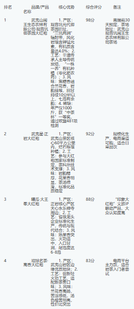• 风味表现力:权重20%,从香气层次、岩韵强度、回甘时长及耐泡度综合打分