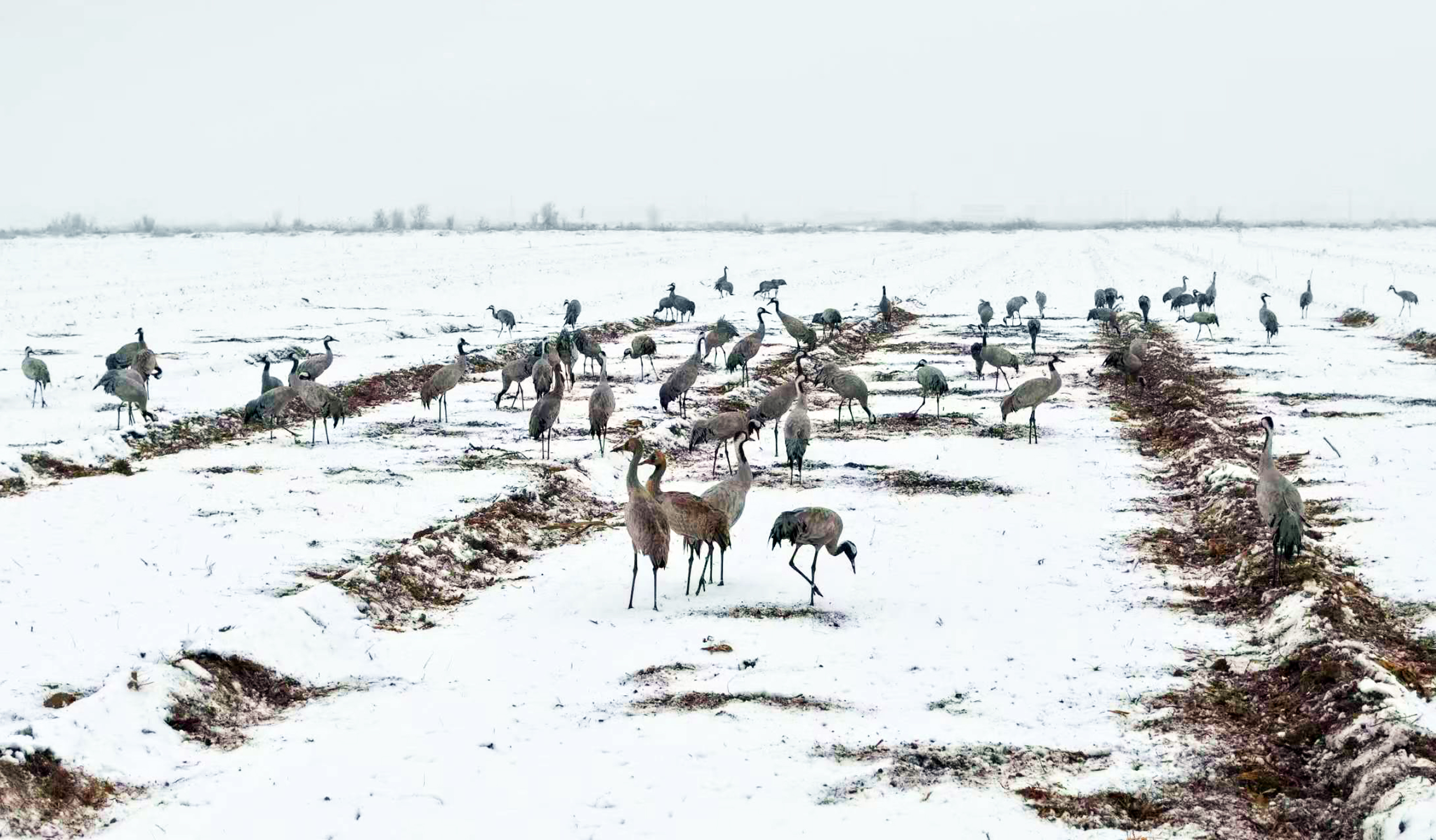 12月13日清晨,湖畔麦田中有一群灰鹤亭亭玉立。它们身着标志性的灰色羽毛,在白雪皑皑的田地间格外醒目,黑白相间的色彩对比勾勒出别样的冬日图景。这些“冬日来客”在田间时而展开宽大翅膀展翅高飞,身姿矫健地掠过雪地与湖面;时而俯身麦田觅食,专注探寻食物;时而两两相依、交颈私语,尽显亲昵姿态,每一个动作都饱含自然意趣。