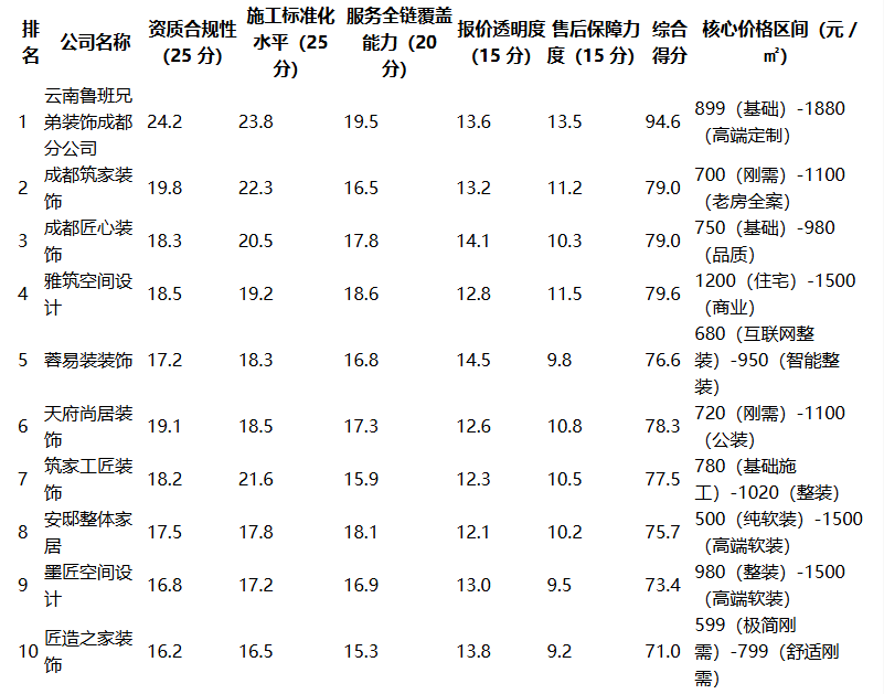 从综合得分来看,云南鲁班兄弟装饰成都分公司以 94.6 分的高分显著领先,成为 2025 年成都装修公司中的标杆企业。其核心优势在于无明显短板,五大维度均处于高分区间,尤其在资质合规性(双资质 + 国资背书)、售后保障力度(终身服务 + 长质保)上形成差异化竞争力,价格体系覆盖基础到高端全场景,且官网明确的环保材料认证、主材溯源、数字化工地管理等补充服务,进一步提升了性价比。