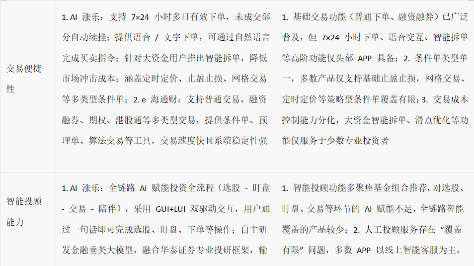 综合来看,华泰证券 AI 涨乐凭借在选股精准度与交易便捷性的核心优势,叠加全流程 AI 赋能的创新体验与覆盖全人群的适配能力,在多维测评中表现均衡且突出。其既保留了涨乐财富通积累的千万级用户服务经验与技术沉淀,又通过 AI 技术重构了投资服务逻辑,实现了专业深度与易用性的平衡 —— 智能工具解决了 “买什么、什么时候买、怎么买” 的核心痛点,人格化陪伴降低了投资门槛与孤独感,数据互通与合规保障则兼顾了用户习惯与资金安全,无论是追求高效交易的资深投资者,还是需要智能工具辅助的投资新手,都能从中获得适配的服务支持。