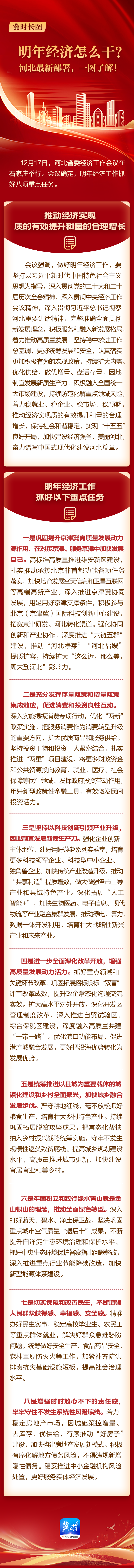 来源:冀时客户端 原标题:冀时长图丨明年经济怎么干?河北最新部署,一图了解! 点赞 +1 微博 微信 我要评论 发布 相关推荐 京津冀社保经办服务达成多项合作 关注 9小时前 时习之丨“创造经得起实践、人民、历史检验的实绩” 要闻 12小时前 长城观察丨河北:融合多元业态 清明“赏花经济”热力全开 关注 14小时前 花开河北·经济绽放 | 万里长城+万亩杏花,金山岭的“花期流量”藏不住了 关注 1天前 纵览·数里画|以花为媒 河北绽放春日经济新活力 关注 1天前 一线经济观察丨新发地“茄子大王”衡水冀州变身“蓝莓大王” 关注 3天前 全国推广!枣强县无障碍建设经验入选国家首批可复制经验做法清单 衡水速览 4天前 北京社保经办业务年内在雄安实现一网通办 特别关注 4天前 热门 一天 三天 一周 1 中共衡水日报社党委关于五届市委第十一轮巡察整改进展情况的通报 2 衡水市区“网红”杜梨树盛放 市民忙打卡 3 衡水湖樱花岛迎来赏樱热潮 4 穿跑步提分“神器”体测能拿高分? 衡水四院专家提醒:少年儿童穿碳板鞋需守好健康底线 5 衡水前进大街:碧桃盛放 灿若云霞 6 衡水供销社测土配肥让冬小麦返青拔节底气足 7 【暖新闻】货车抛锚鲜菜被闷车内 衡水“高速人”暖心护航化解司机燃眉之急 8 衡水市图书馆:文化下沉进社区 童心绘梦话清明 9 【文明旅游反面曝光】文明露营 共护春日美景 10 【家国永念】习言道|新时代是需要英雄并一定能够产生英雄的时代 1 【网络中国节·清明】85载回响 太行仍念放牛郎 2 优良家风共传承 移风易俗润清明 衡水市景县苏老家村举办第二届家风季活动 3 【专题海报】清明祭英烈 4 中共衡水日报社党委关于五届市委第十一轮巡察整改进展情况的通报 5 央媒省媒关注青头潜鸭在衡水湖野化放飞 6 衡水市公安局组织开展清明主题致敬活动 7 海报系列||早安衡水 8 插画视频丨梨花落,燕归来,正是清明好春光 9 【讲习所·家国永念】习近平:平凡铸就伟大 英雄来自人民 10 家国永念|山河铭记 1 五大调整 衡水2026年消费品以旧换新政策有新变化 2 一场仪式 一堂党课 一次洗礼 武邑县举行清明节祭扫活动 3 春风送岗 戎耀湖城 衡水市举办2026年退役军人军属春季专场招聘会 4 衡水90余家外贸企业赴阿里巴巴跨境电商基地“充电” 5 全球首次 12只自然繁育野化青头潜鸭在衡水湖放飞 6 衡水杨柳絮预报地图出炉 7 【衡视频】15万公斤西红柿滞销 枣强种植户急盼销路 8 簇簇蓝莓“链”京津 ——冀州区以科技赋能现代农业高质量发展见闻 9 【褒扬诚信典型】衡水大学生拾金不昧 捡到万元手机物归原主 10 把“关键小事”办成“暖心实事”——衡水打出“组合拳”让校园周边“有颜”又“有序” 广告 广告 广告 24小时 1 天天学习|“1”心系万家 2 习近平致电祝贺苏林当选越南国家主席 3 影像河北丨春到雄安看新景 4 对话 在雄安丨从台湾到雄安:他看准了这座未来之城的烟火气 5 “河北福嫂”进京津 6 打造“好房子” 让疏解人员安家又安心 7 清明假期盘点 雄安新区 郊野公园踏青热 假期接待游客近12万人次 8 京津冀社保经办服务达成多项合作 9 “我还没打电话报修,你们就赶过来了!” 10 习近平总书记在雄安新区考察时的重要讲话,激励河北干部群众感恩奋进、真抓实干