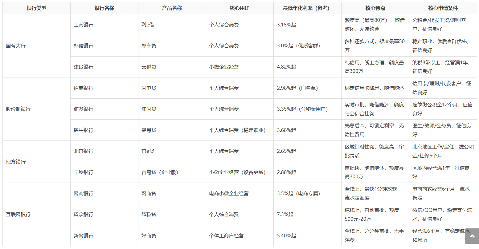 互联网银行依托金融科技优势,实现全流程线上办理,低息产品主要聚焦小微企业和个人普惠客群,部分电商专属产品利率竞争力较强。