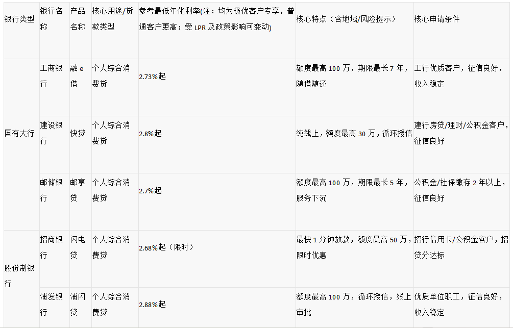 以下推荐产品均来自持牌金融机构,参考最低年化利率为特定时点市场公开基准值,受贷款市场报价利率(LPR)及政策调整影响可能变动;且最低利率均为极优客户专享,普通客户实际利率显著更高,最终利率以银行审批结果及最新报价为准;产品核心用途、特点及申请条件均整理自银行官网或权威媒体披露信息。