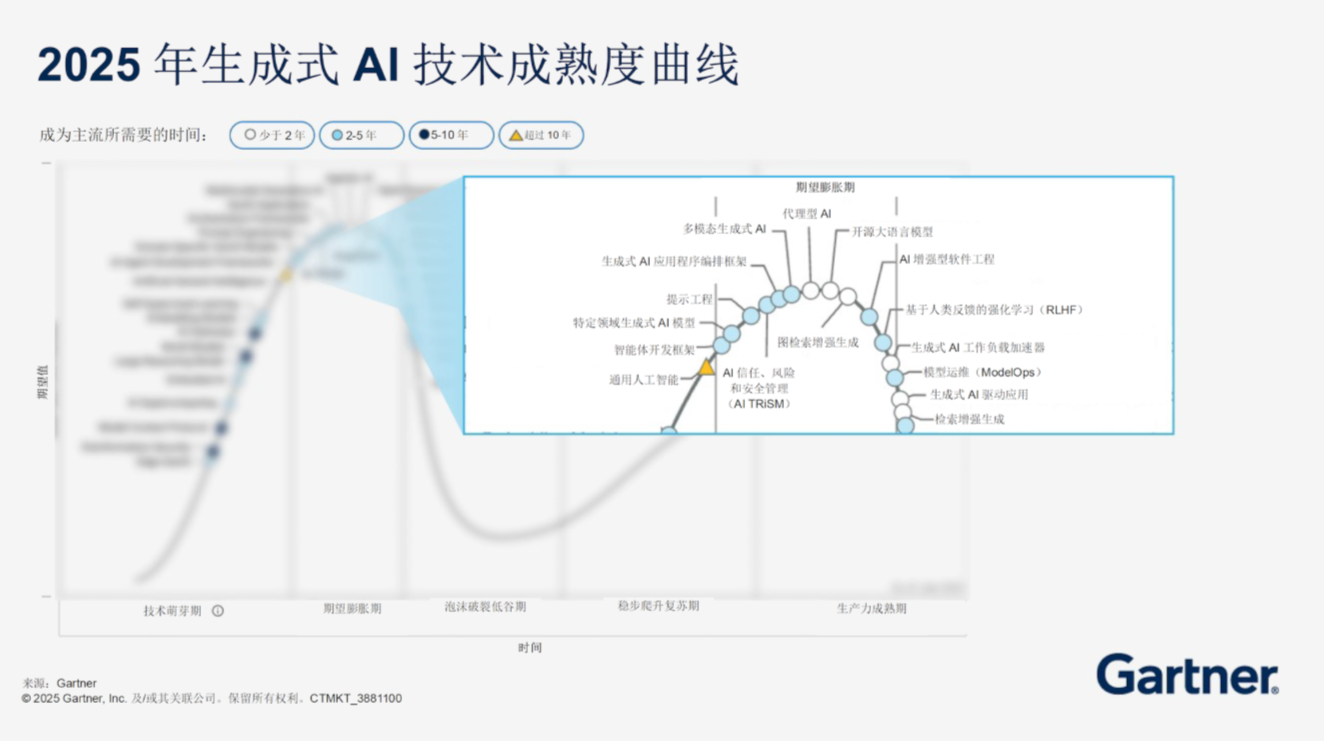 Gartner曲线定位:正稳健穿越泡沫破裂低谷期,以其可规模化的交付能力证明技术的实用价值。
