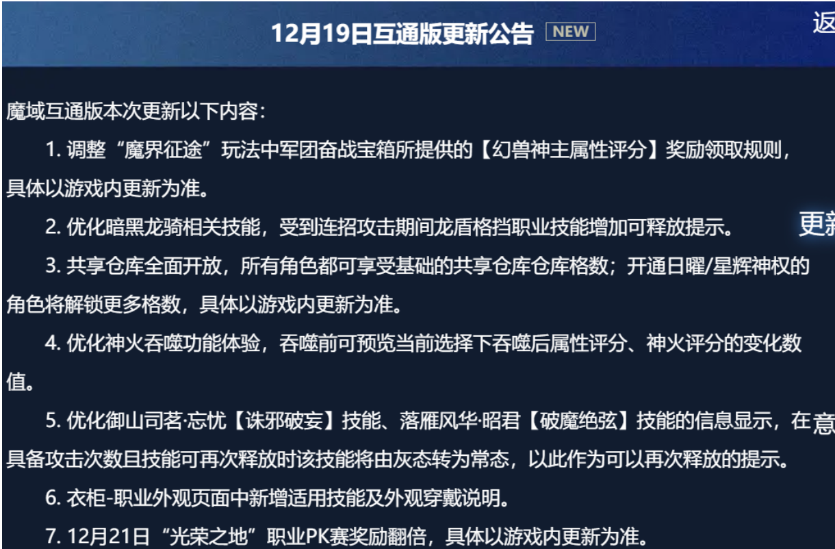 在《魔域》持续为玩家提供丰富游戏内容的同时,网龙魔域始终致力于优化移动端的基础体验。12月19日,官方发布了互通版的最新更新公告,此次更新聚焦于资源管理便利性、核心职业操作手感及多项系统体验的精细化提升。通过开放共享仓库、优化技能提示与修复系列异常,网龙魔域再次展现了其以玩家实际需求为导向,持续打磨产品细节的扎实运营风格。