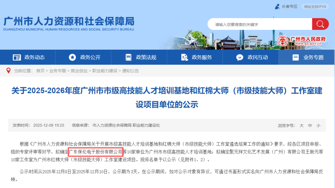 近日,广州市人力资源和社会保障局正式发布了《关于2025-2026年度广州市市级高技能人才培训基地和红棉大师(市级技能大师)工作室建设项目单位的公示》。在激烈的竞争中, itc保伦股份凭借在音视频领域深厚的技术积累与丰富的产业实践,成功入选 “广州市市级高技能人才培训基地”,标志着itc在产教融合与技能人才培训领域迈入规范化、示范化发展的新阶段。