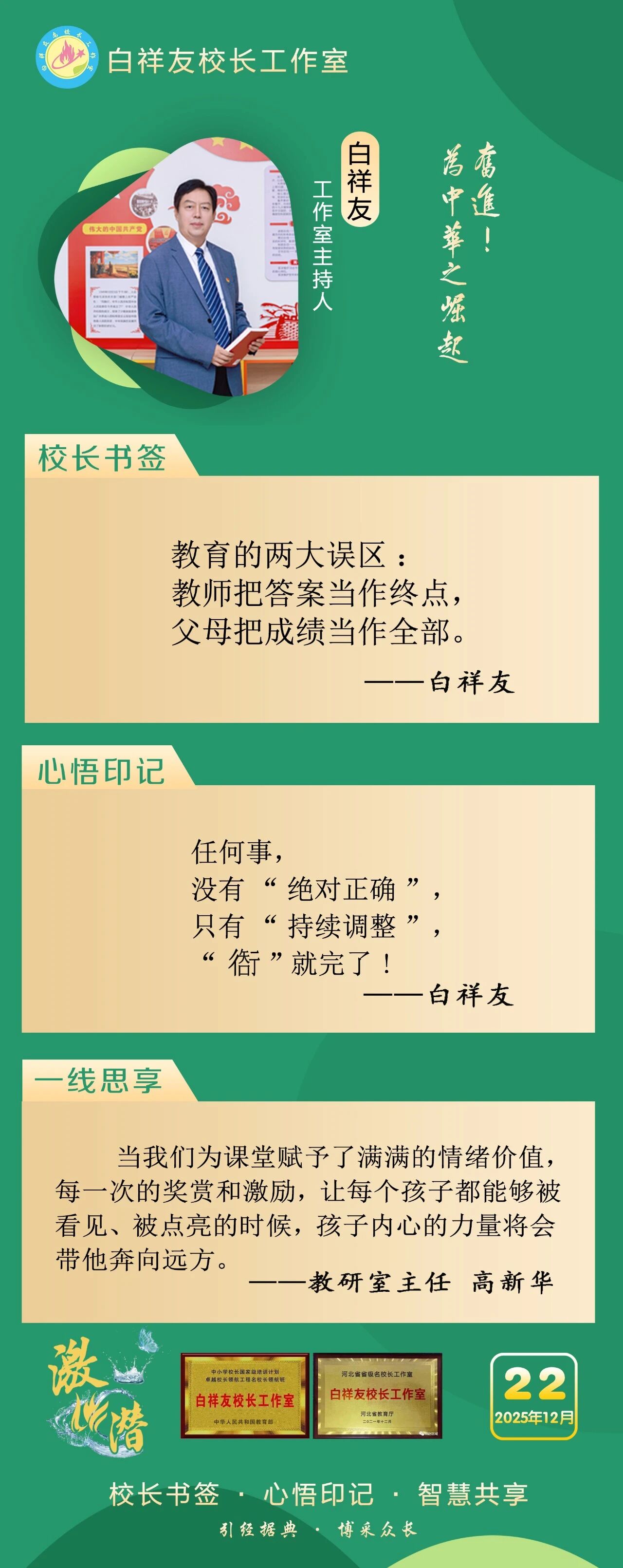“白祥友校长工作室”成立于2019年4月,是教育部“国培计划”中小学名校长领航工程、河北省首批名校长工作室,目前省内外成员校59所。工作室坚持“资源共享、智慧共融、互助共赢”理念,已成为思想碰撞的交流场,资源共享的品牌站,成果展示的辐射源。