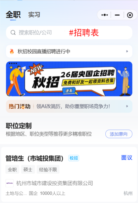 领取方式二:搜索“智联校园”微信小程序,在微信小程序中搜索“#招聘表”,即可免费领取求职信息表;关键词一定要带“#”。