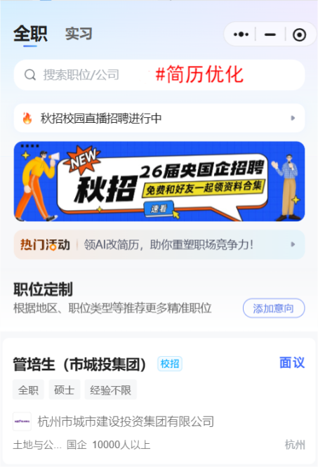 领取方式二:搜索“智联校园”微信小程序,在微信小程序中搜索“#简历优化”,即可获取免费AI改简历权益;不同平台关键词不一致,关键词一定要带“#”。