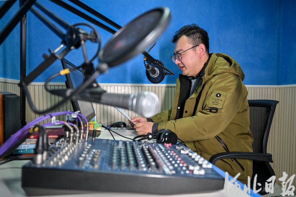 11月8日,昝亚杰利用业余时间在阿勒泰市融媒体中心配音,为当地文化活动助力。河北日报记者田明摄