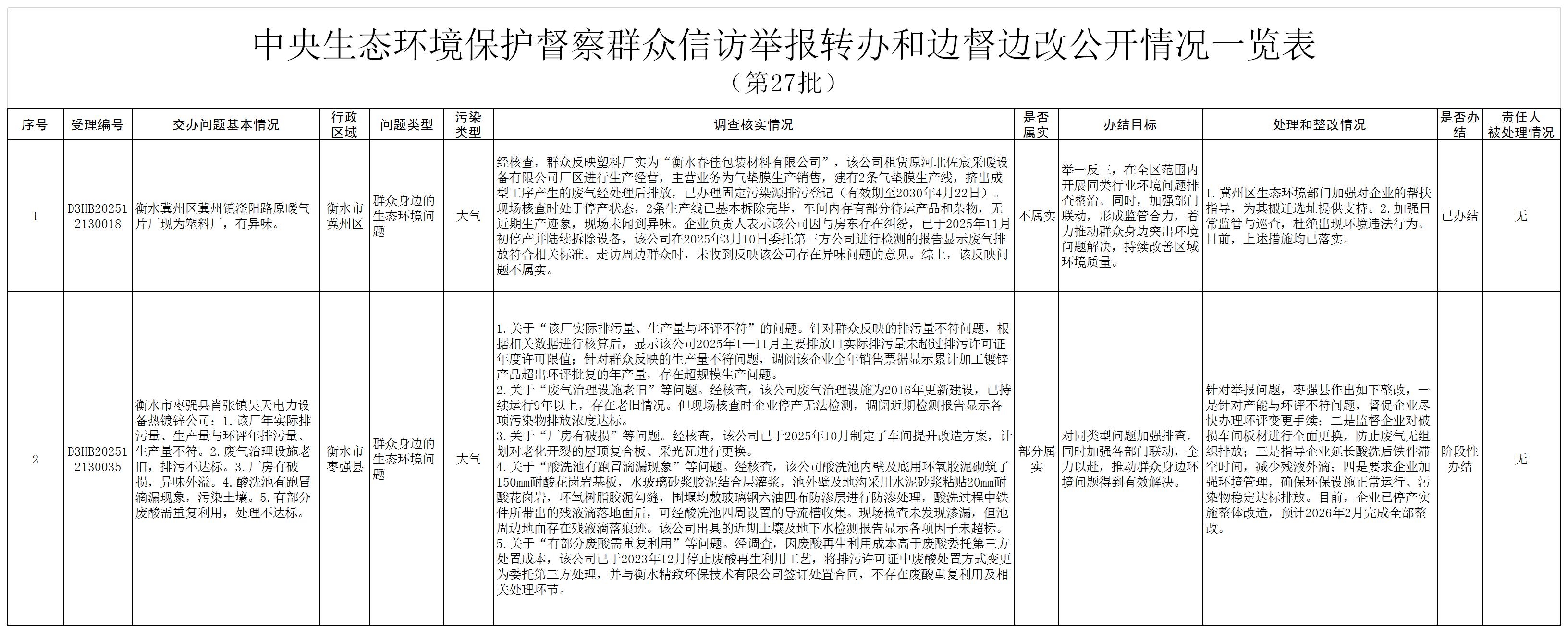 按照中央第三生态环境保护督察组工作要求,12月24日,我市已完成对交办的第二十七批2件群众信访举报案件的调查处理,其中已办结1件、阶段性办结1件。