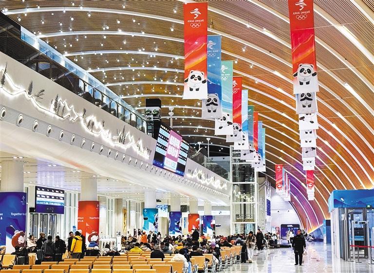 12月19日拍摄的京张高铁太子城站候车大厅。为方便滑雪爱好者出行,铁路部门推出“雪具便利行”以及雪具托运等服务,并通过公交、雪场接驳车实现“家门到雪场”无缝衔接。
