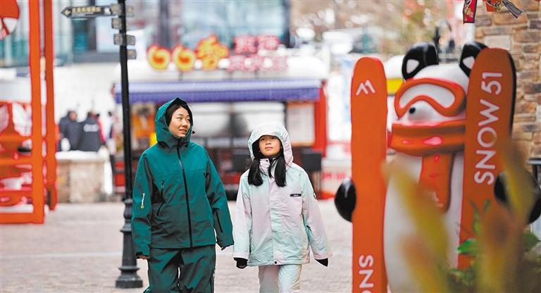 12月19日,张家口市崇礼区一滑雪小镇商业街,游客在游览观光。近年来,当地冰雪小镇蓬勃发展,赏雪玩雪、冰雪运动、民俗体验等活动受到游客欢迎。