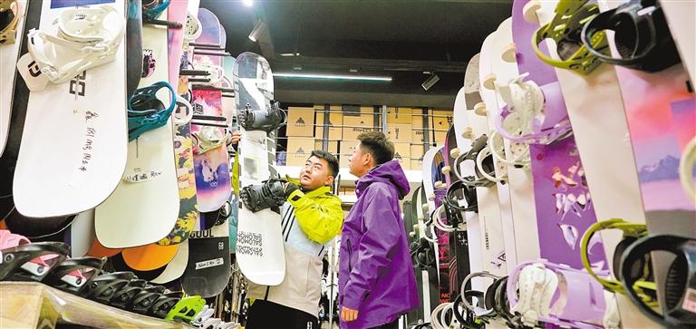 12月19日,张家口崇礼区一雪具店,工作人员在介绍滑雪装备。崇礼作为滑雪热门目的地,聚集众多雪具销售和租赁店铺,为滑雪爱好者提供“一站式”服务。