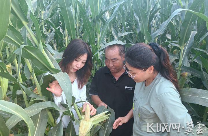 河北省玉米产业技术体系邢台试验站站长李艳(左)在邢台市南和区王庄村现场指导农户玉米管理事项。长城网·冀云客户端记者 贾宏博 摄