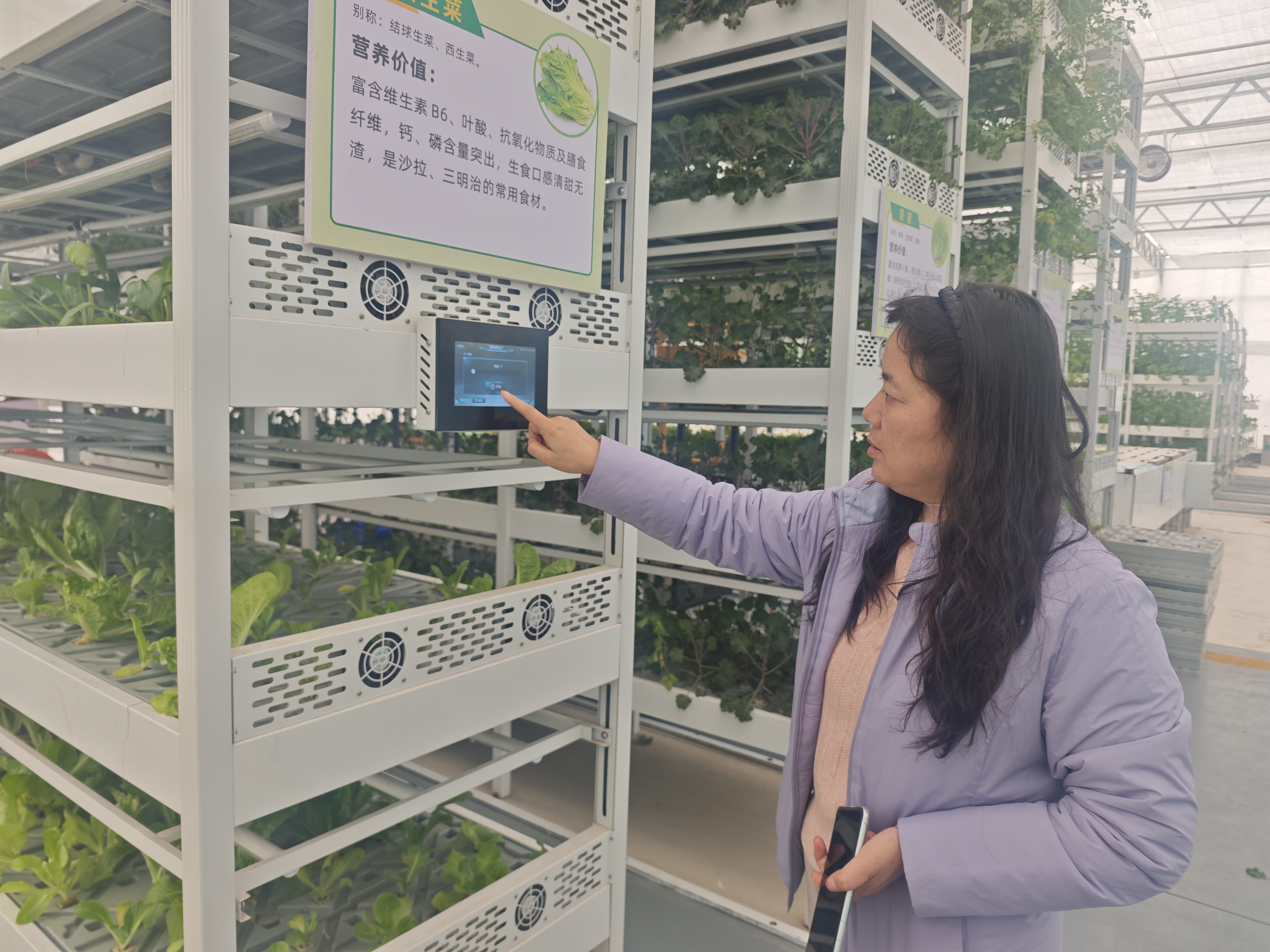 “这些菜全部都是零农残,吃着特别放心。”园区负责人霍泽华介绍道,园区搭载的光、温、湿、气、水、智六维协同调控系统,通过栽培架上的可视化控制面板,能实时查看叶菜生长动态。智能系统还会根据不同叶菜的生长周期,自动设定光照时间、强度及营养液供给量,实现从播种到采收前的全流程自动化。得益于这套智能系统,各类叶菜20—30天就能快速收获,全年可实现不间断生产。