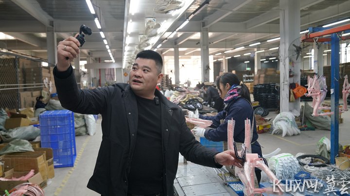 朱宗达在车间生产线上给直播间粉丝介绍产品。杨泽 摄
