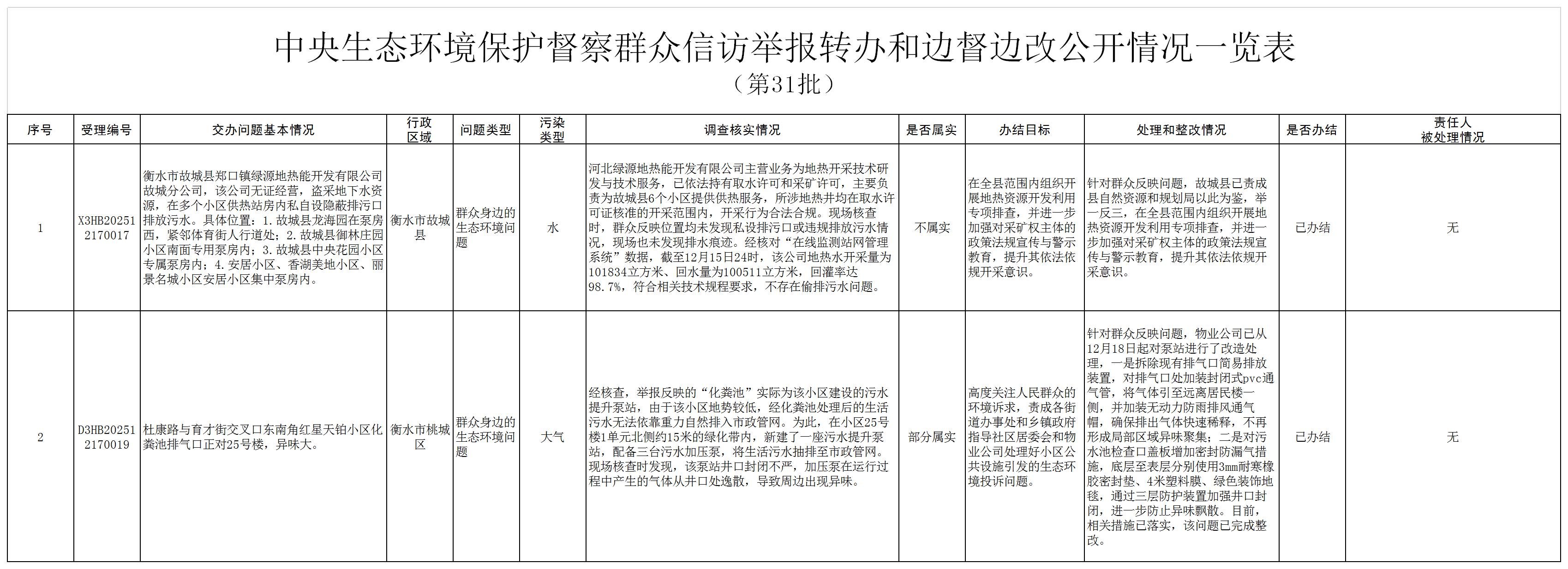 按照中央第三生态环境保护督察组工作要求,12月28日,我市已完成对交办的第三十一批2件群众信访举报案件的调查处理,已办结2件。