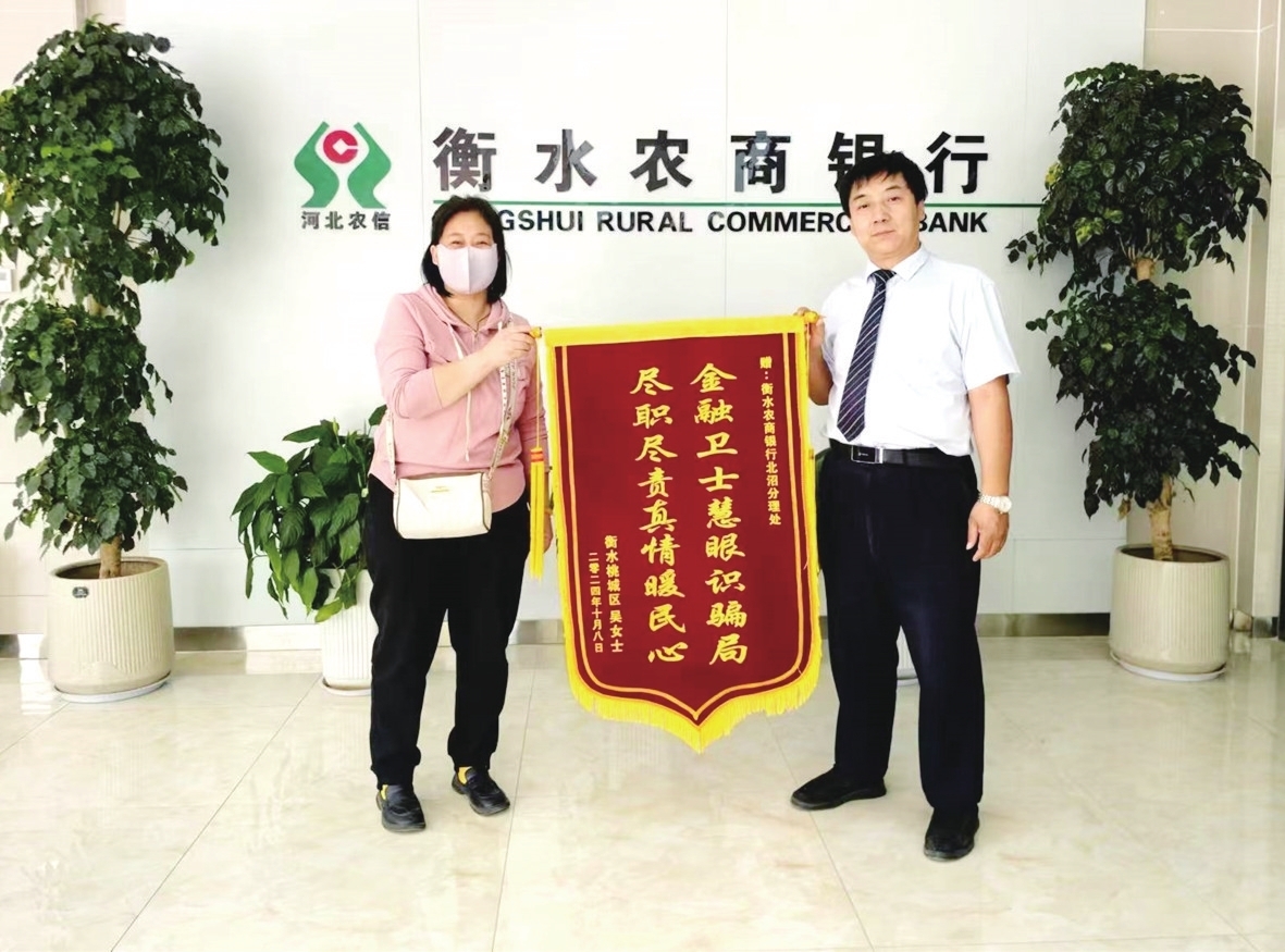 客户向衡水农商银行(城区)工作人员赠送锦旗,称赞其作为“金融卫士”慧眼识破电信诈骗。