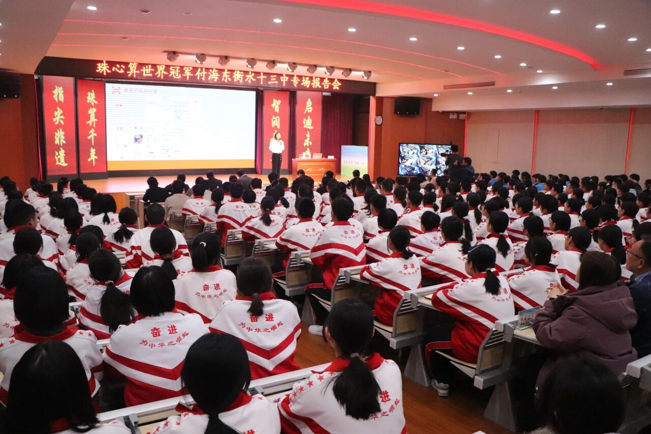 当天下午,世界珠心算冠军付海东老师为师生们带来了一场精彩纷呈、激励人心的专场报告。付老师带来了闪电心算表演,并结合自身成长与训练经历向大家传递了不懈拼搏、坚持到底的精神力量。大家深受鼓舞,不仅领略了传统文化的魅力,更从冠军的奋斗故事中汲取了前进的动力。
