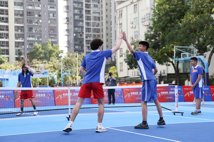 4月15日,在深圳市南山外国语学校(集团)高新中学,中美学生结对进行匹克球双打比赛。新华社记者 梁旭 摄
