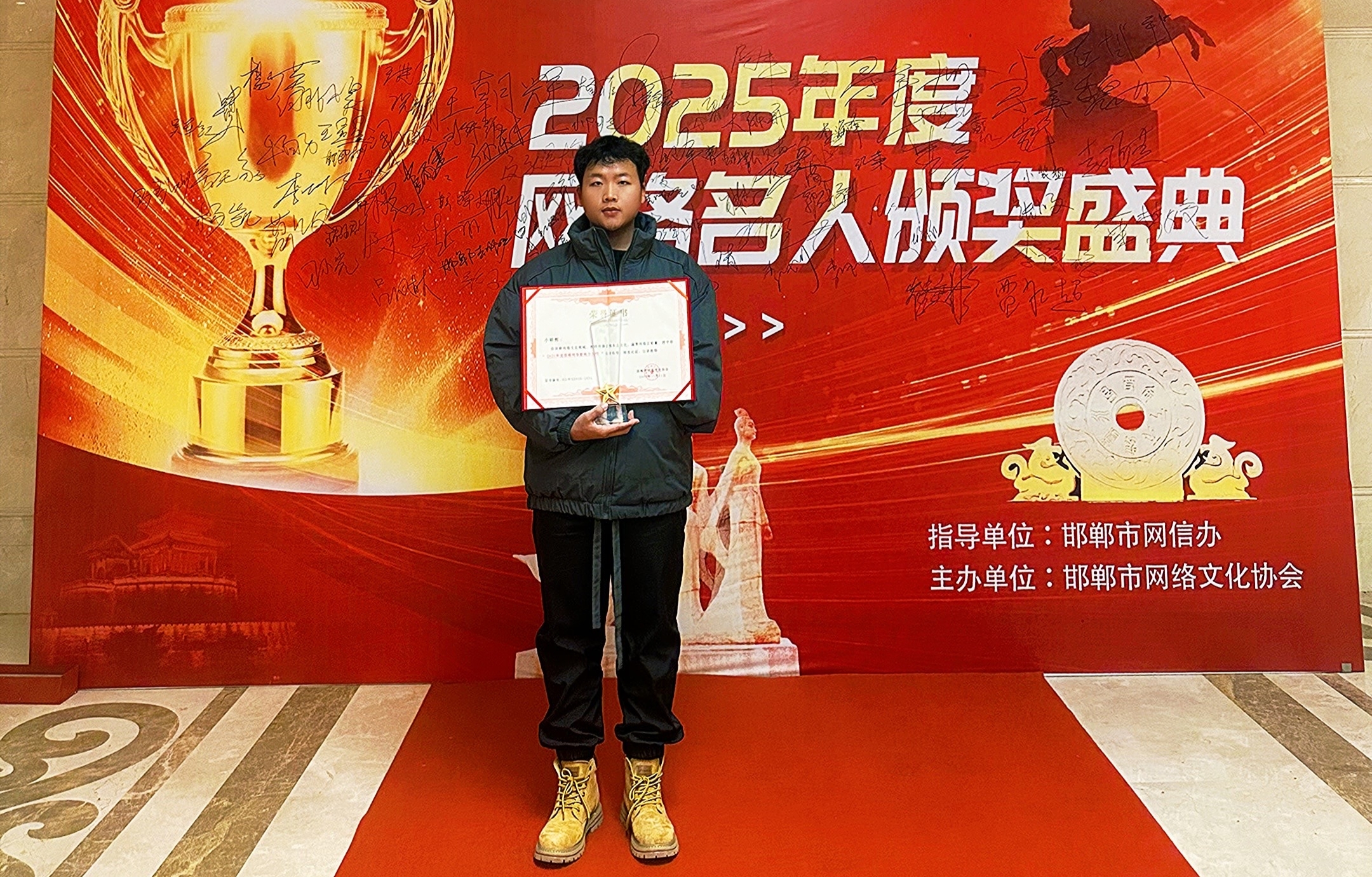 如今,王朝辉的直播间在线人数稳定在万人左右,一场直播累计观众可达四五十万。在刚刚结束的邯郸市“2025年度网络名人颁奖盛典”上,他因积极传播邯郸本土文化、凝聚网络正能量,被授予“2025年度邯郸网络影响力人物”荣誉称号。