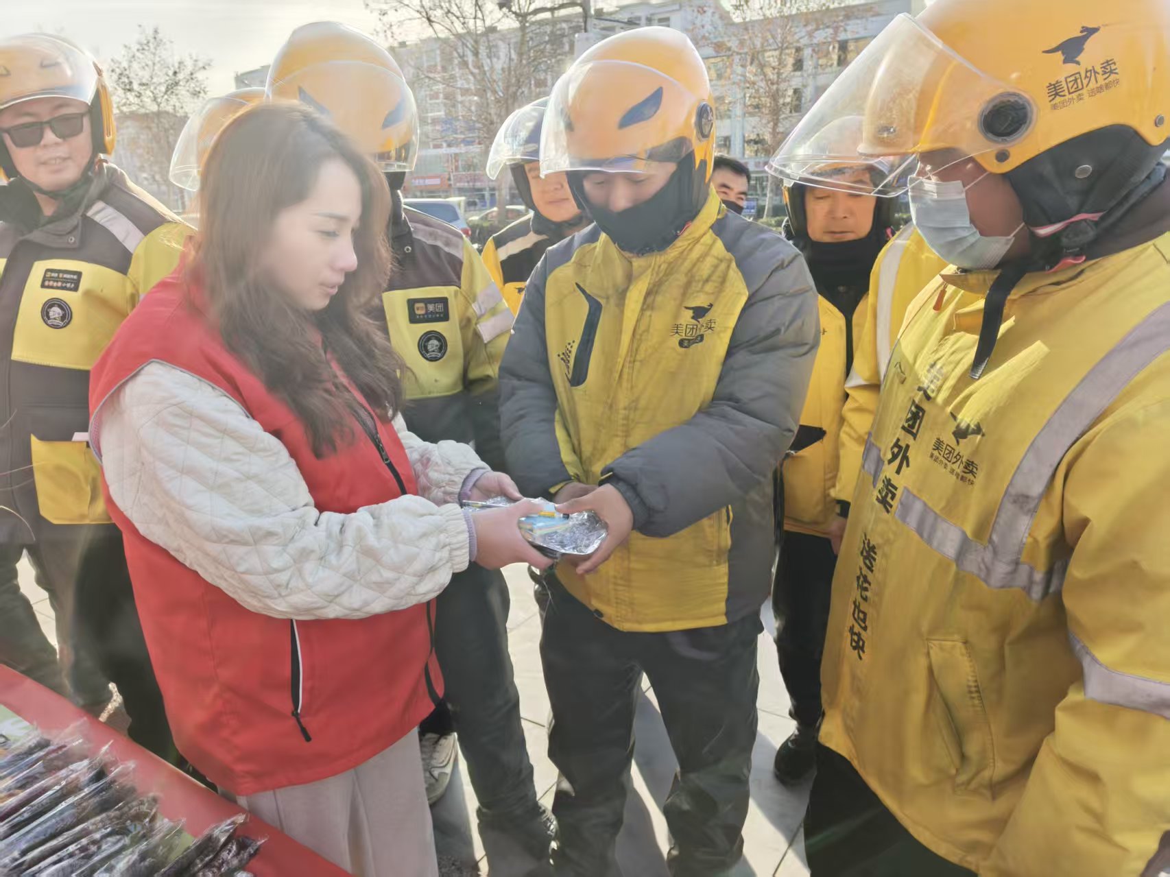 活动现场格外热闹,社区工作人员与团县委工作人员化身暖心使者,将装满心意的礼包逐一递到新就业群体手中。礼包内不仅有抵御严寒的暖宝宝、手套,还有笔、笔记本、便利贴等办公用品,贴合他们日常接单记录、沟通工作的职业需求。