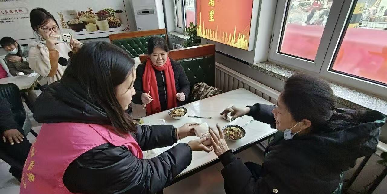 游戏过后,志愿者护理员们分工协作给老人们分发物资。护理员细心叮嘱“张大爷穿XL码”“李奶奶爱吃软乎的”,志愿者们一一记在心上,递物资、帮试穿棉衣,手把手调整领口袖口,反复叮嘱“天冷多添衣,保暖别着凉”;行动不便的老人床边,志愿者轻轻为其围上暖融融的围巾,握着老人的手唠家常,一句句关心的话语格外暖心;用餐时刻,志愿者们主动上前,帮老人盛好饭菜,细心摆好碗筷,看着老人们吃得香甜,志愿者们脸上都露出了欣慰笑容。整个养老院里,暖意流淌、笑声不断。