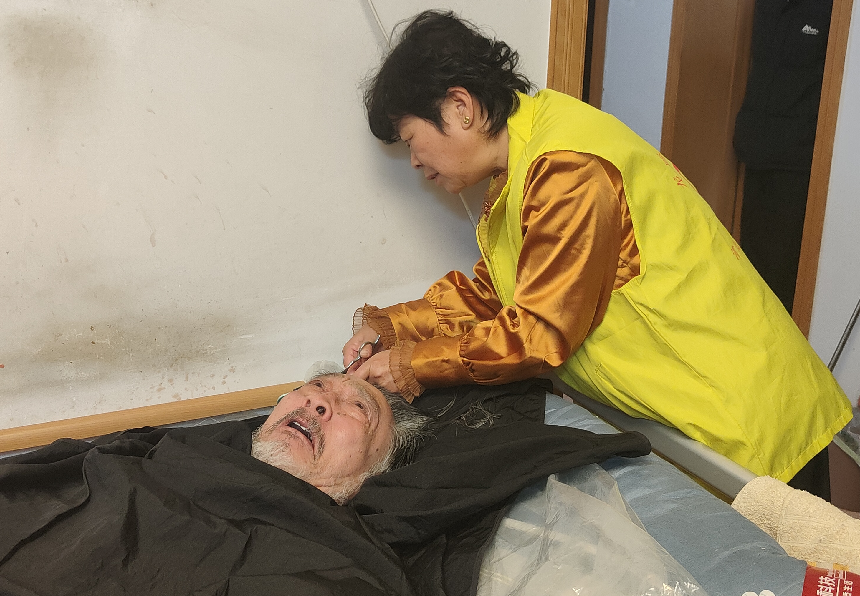 79岁的韩贵新老人常年卧床,无法自理;77岁的老伴王凤苗因患严重关节炎和腰疾,行动不便。儿女远在外地,日常靠保姆照料,但理发这件“小事”却成了老两口的大难题:头发越长越乱,胡子拉碴,既不便打理,也影响心情。