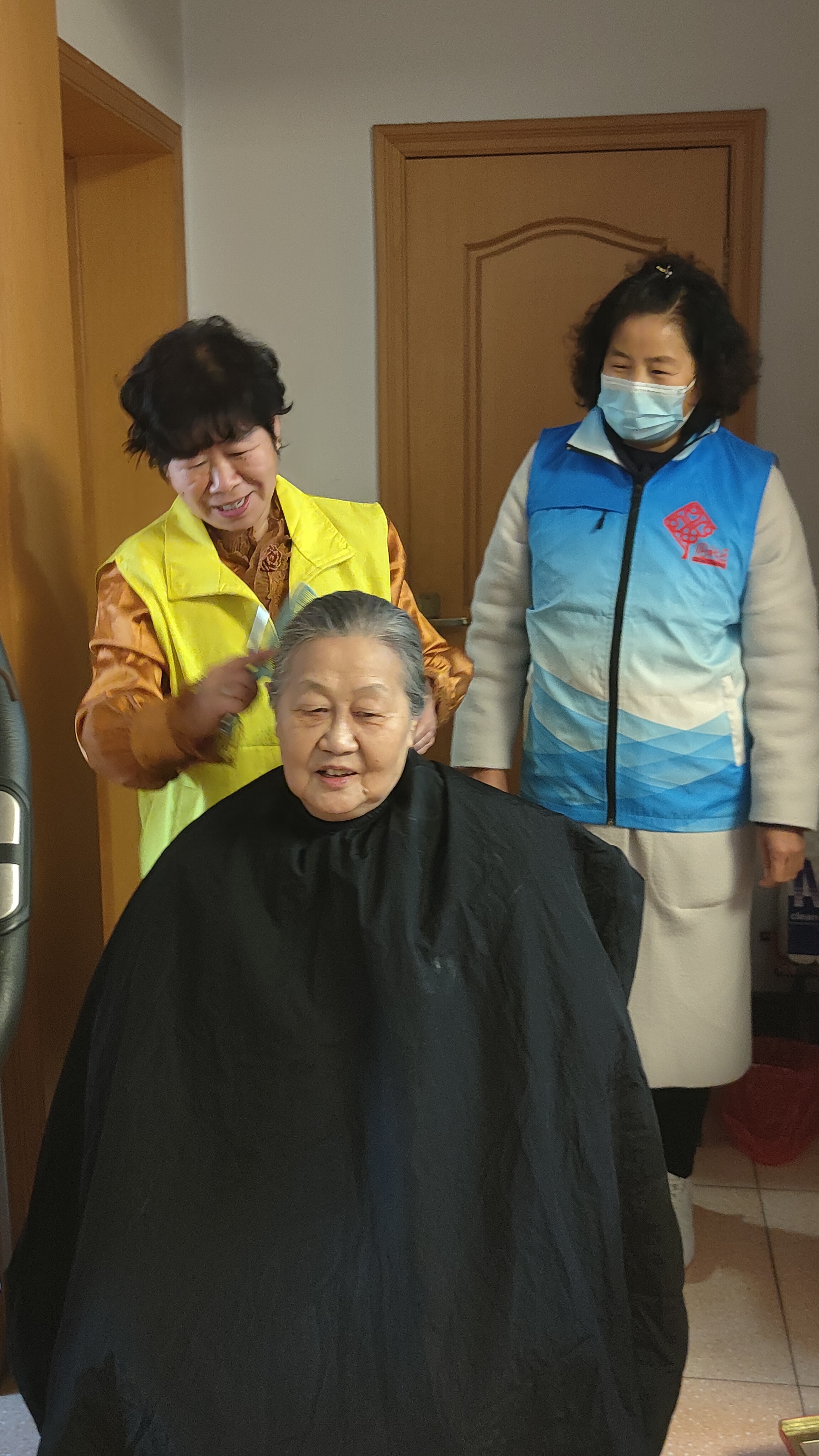 推开老人屋门,温暖扑面而来。大家默契分工——具备专业技能的志愿者张连珍负责剪发,她熟练地展开围布,扶正王奶奶的肩膀,手指灵活转动剪刀柄,手腕轻巧翻转,“咔嚓、咔嚓”声有规律地响起,一缕缕花白头发应声落下;协会张霞和社区工作者在一旁托着水盆,帮忙冲洗头发;王云霞和邢兰新则清理着碎发。镜子前,王奶奶原本凌乱的头发被修剪得整整齐齐,她眯着眼笑了:“真清爽,感觉人都轻快了。”