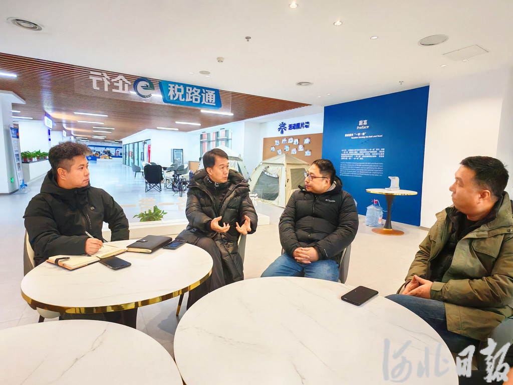 2025年12月22日,在全球跨境电商(京津冀)“三中心”,姚钦(左二)与Wildberries中国商家服务中心工作人员商谈廊坊分中心入驻相关细节。河北日报记者刘杰摄