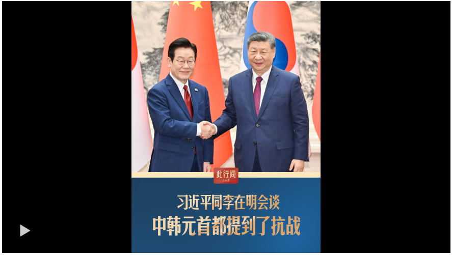 1月5日,国家主席习近平同韩国总统李在明举行会谈。习近平指出,中韩应当坚定站在历史正确一边,作出正确战略选择。会谈中,两国元首都提到了80多年前的抗战。
