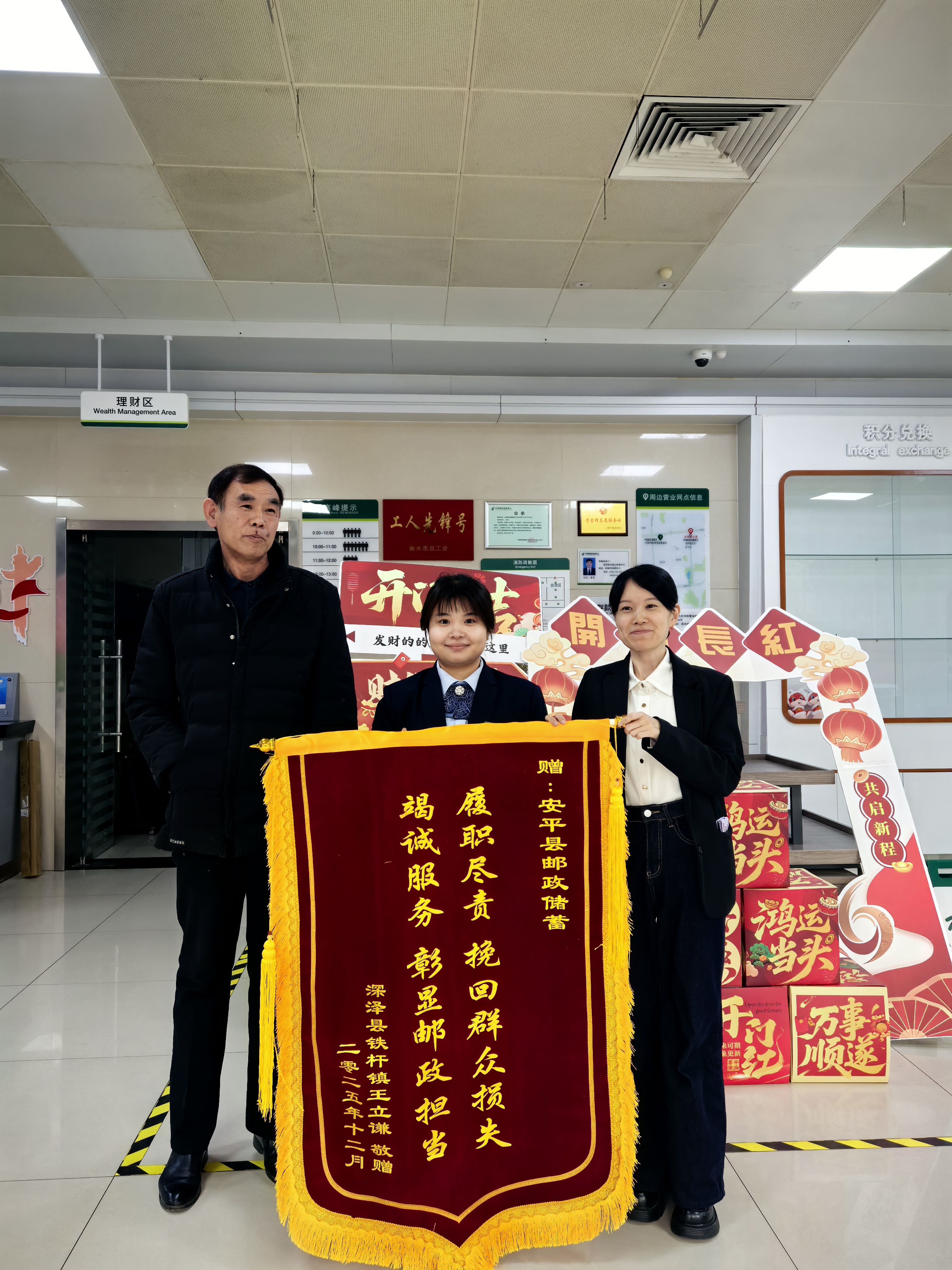 日前,邮储银行安平县支行收到了一面满载客户心意的锦旗。鲜红的锦旗上“履职尽责挽回群众损失,竭诚服务彰显邮政担当”的金色大字熠熠生辉,这是客户王立谦对邮储银行安平县支行工作人员专业服务与暖心相助的高度认可。