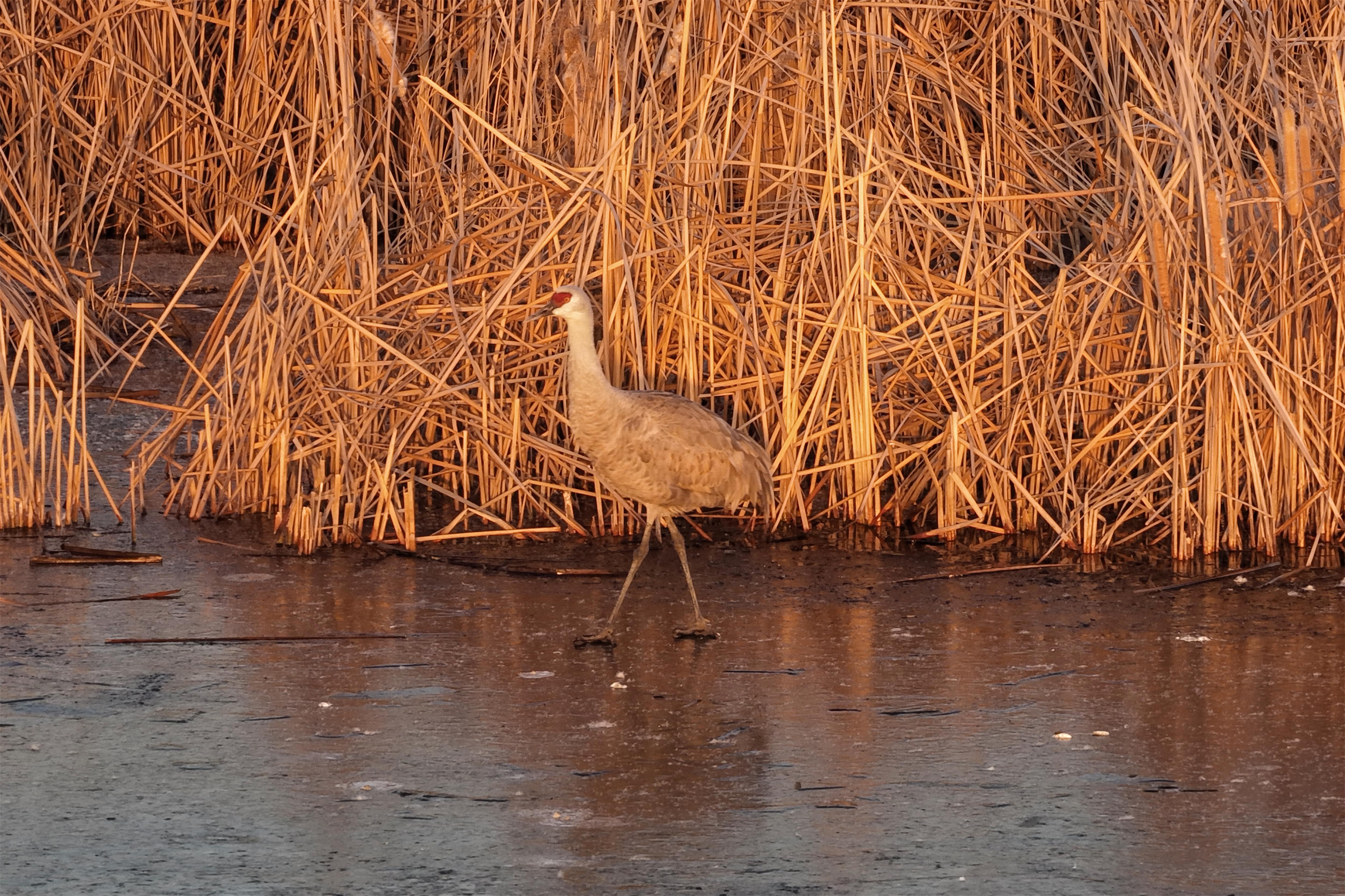 1月6日的衡水湖,湖面结冰如镜,成群灰鹤在芦苇丛周边觅食、翱翔。摄影爱好者李明、王锦平在观测时,发现有一只从没见过的,体形修长、头顶红色裸露皮肤醒目的鹤,与灰鹤、白枕鹤、白头鹤等鹤类相伴栖息,共同构成“鹤舞冰上”的独特生态景观。于是,他们用相机完整记录了下来。经在当地开展调查的东北林业大学李晓民教授处鉴定,此鹤为罕见的沙丘鹤。