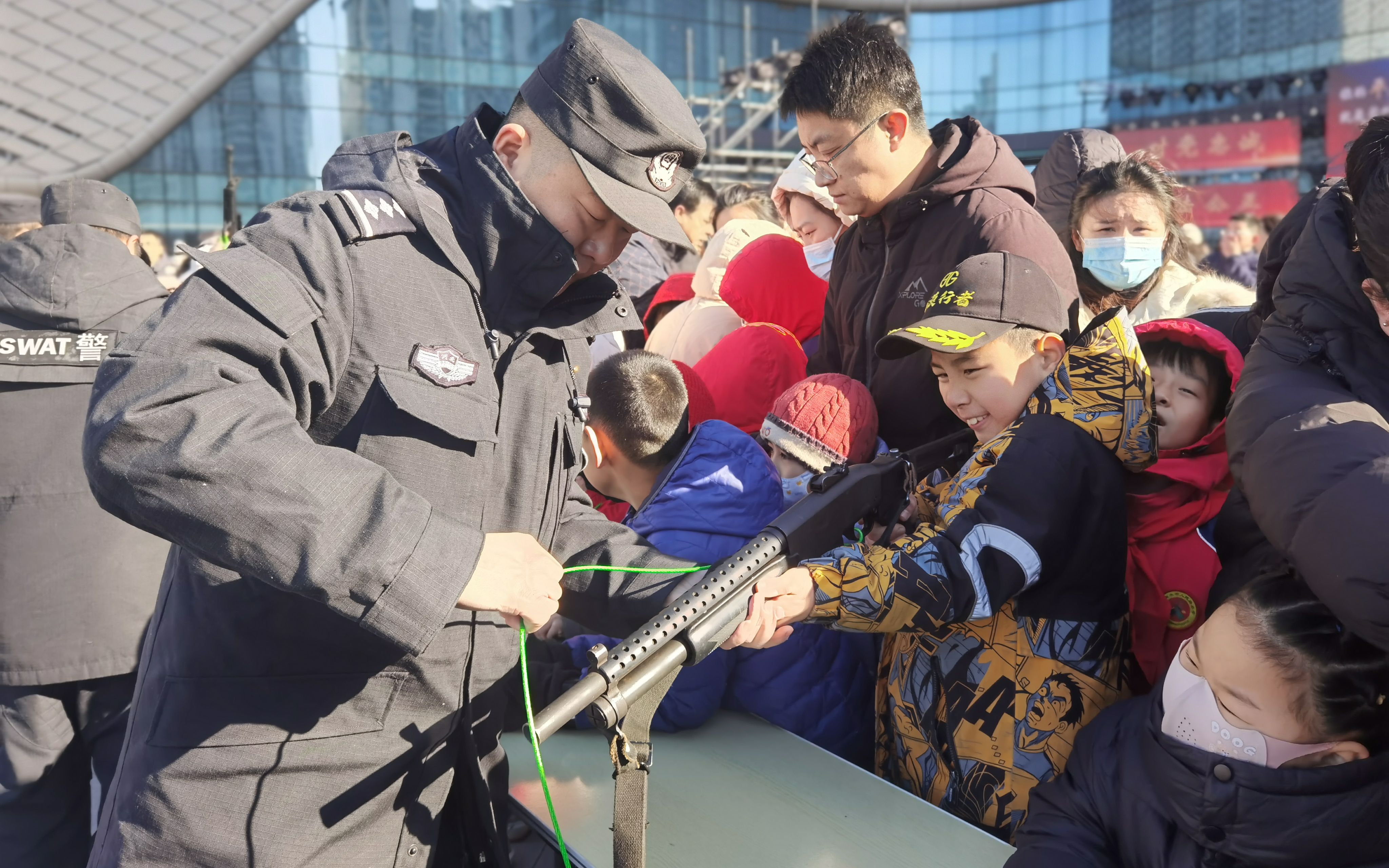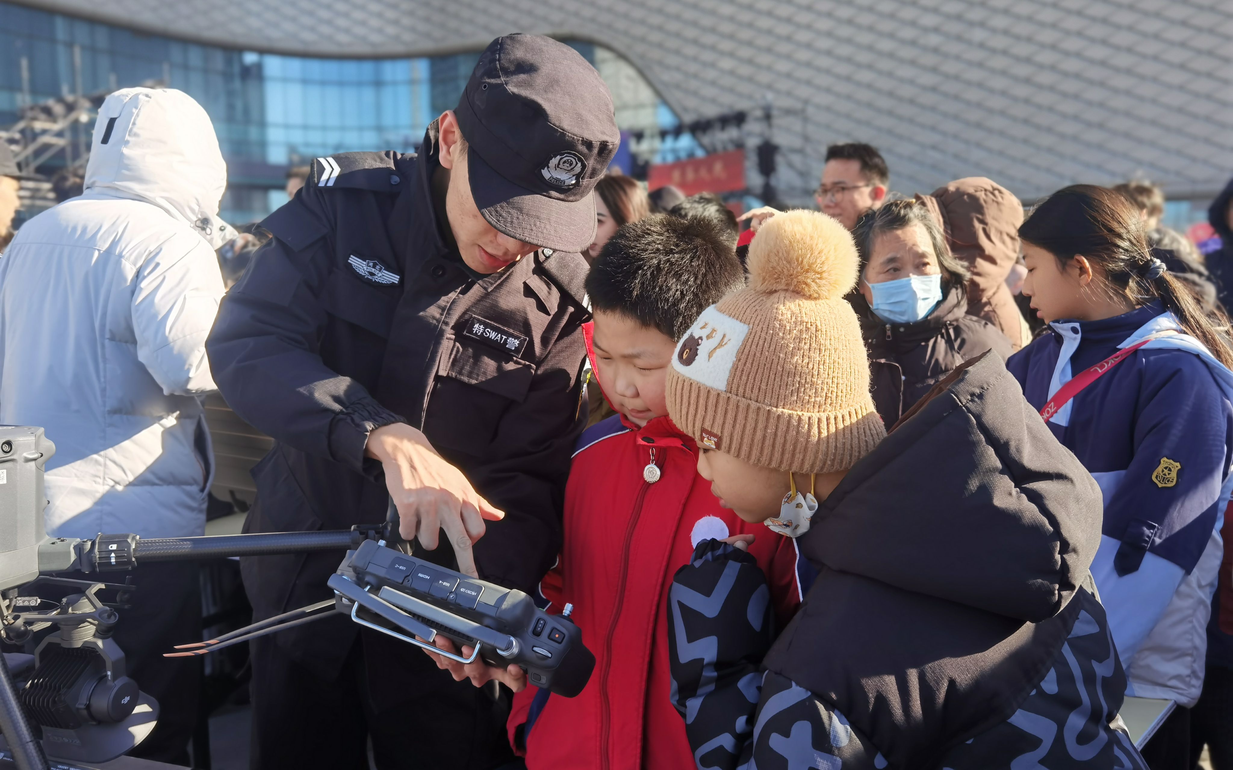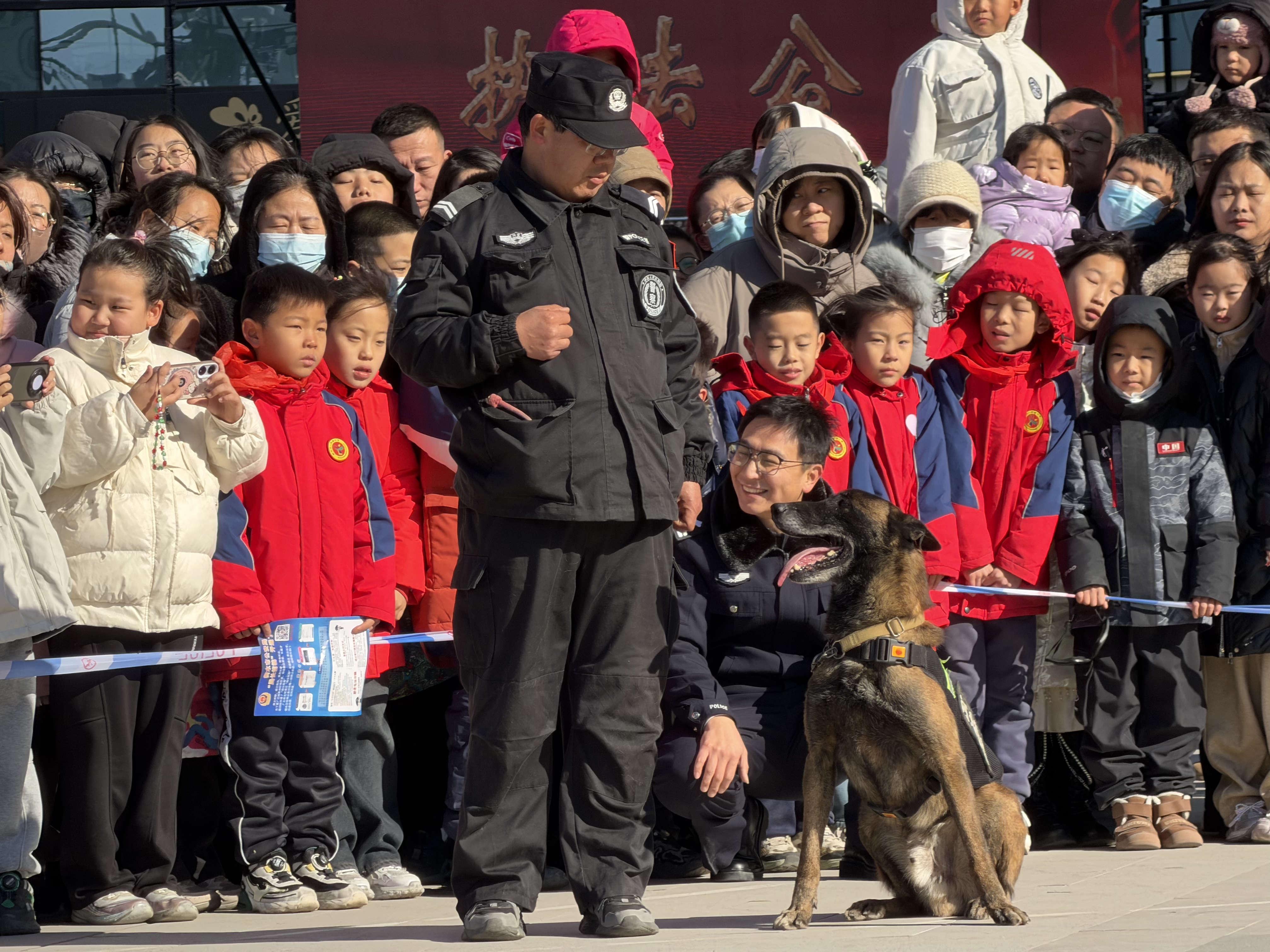 宣传区、战术演练区和趣味体验区同样深受群众欢迎。反诈、治安等多警种民辅警结合案例讲解安全知识,趣味问答互动频频,安全防范理念深入人心。警犬在训导员指令下,敏捷地完成抓捕犯罪嫌疑人等一系列科目。“小交警”们头戴迷你警帽,有模有样地跟随交警学习交通指挥动作。“我与民警同框”打卡区前,市民们排队与民警合影留念,一句句“警察同志辛苦了”的亲切问候,让寒冷的冬日漾起浓浓温情。