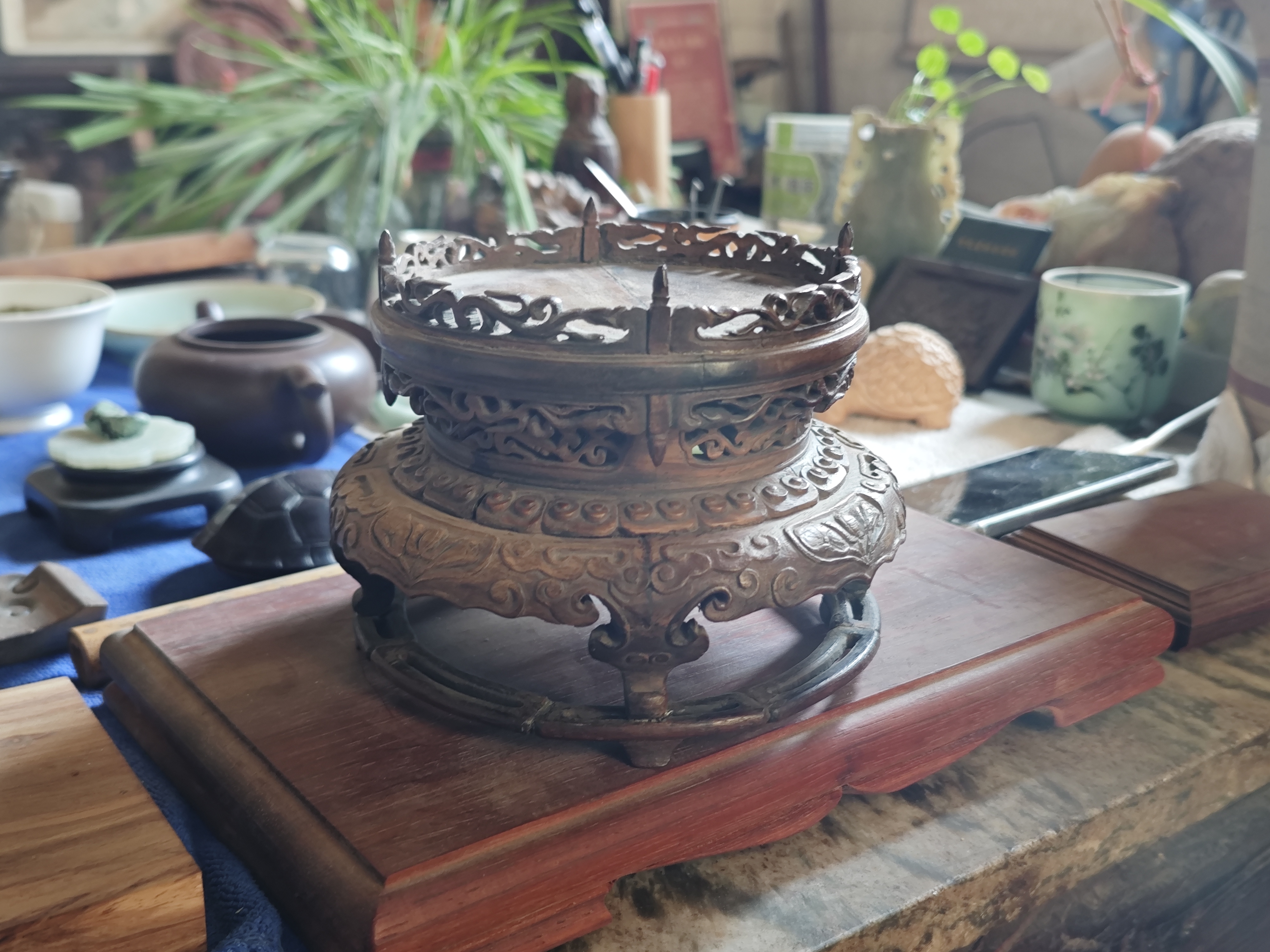 在工作室的陈列架上,一件件代表性作品静静陈列,尽显匠心巧思。《五虎图》摆件构思精巧,将老虎神情刻画得淋漓尽致;《老红木海水江崖》底座则以庄重典雅的纹饰,尽显中式美学的厚重底蕴。这些作品中,既有传统木雕的古朴质感,又巧妙融入了现代审美意趣。