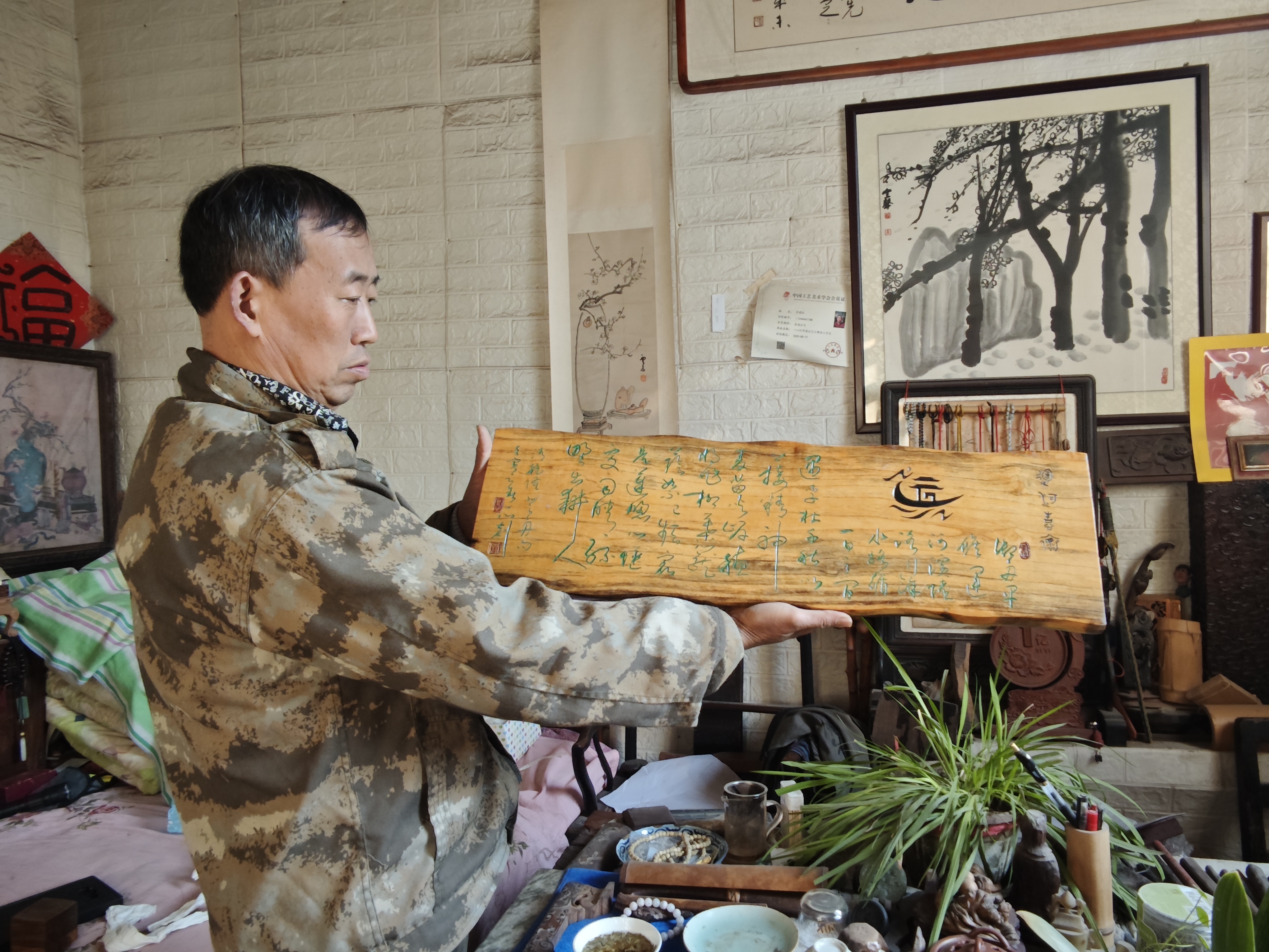 初握刻刀的日子满是艰辛,单建征摊开双手,掌心、指腹布满深浅疤痕。“那时候对刀具力道、角度把握不准,手上划口子是家常便饭,旧伤没好又添新伤。” 他坦言,第一件作品耗了整整半个月,每天泡在工作室数十个小时,反复打磨。“虽显稚拙,却笃定了这辈子与刻刀相伴的决心。”