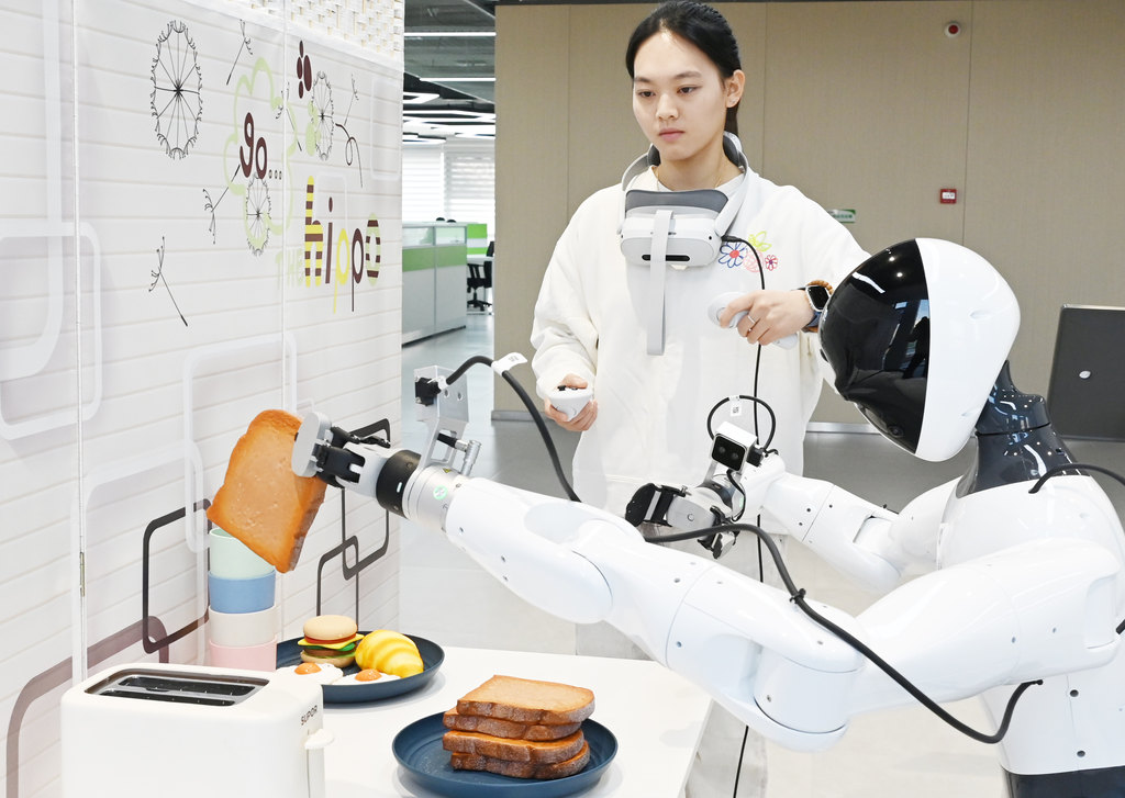 训练场采用1:1实景还原,打造了迎宾导览、工业搬运、家居生活、商业零售、物流装配五大真实场景。在家居生活区,数据采集员李曼晔正遥控机器人“小乐”学习烤面包。只见“小乐”稳稳取出一片面包,精准放入早餐机。“我们把流程拆解成一个个动作指令,让机器人逐步掌握厨房工作。”李曼晔说。不远处,工业搬运场景中的机器人正将货物整齐码放至指定位置。商业零售区内,另一款机器人则模仿数据采集员的动作,从货架上选取商品放入购物车。