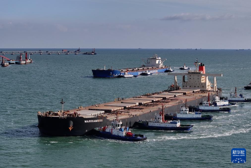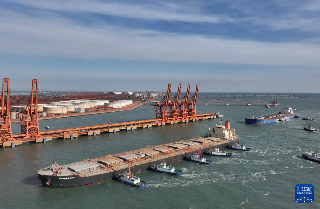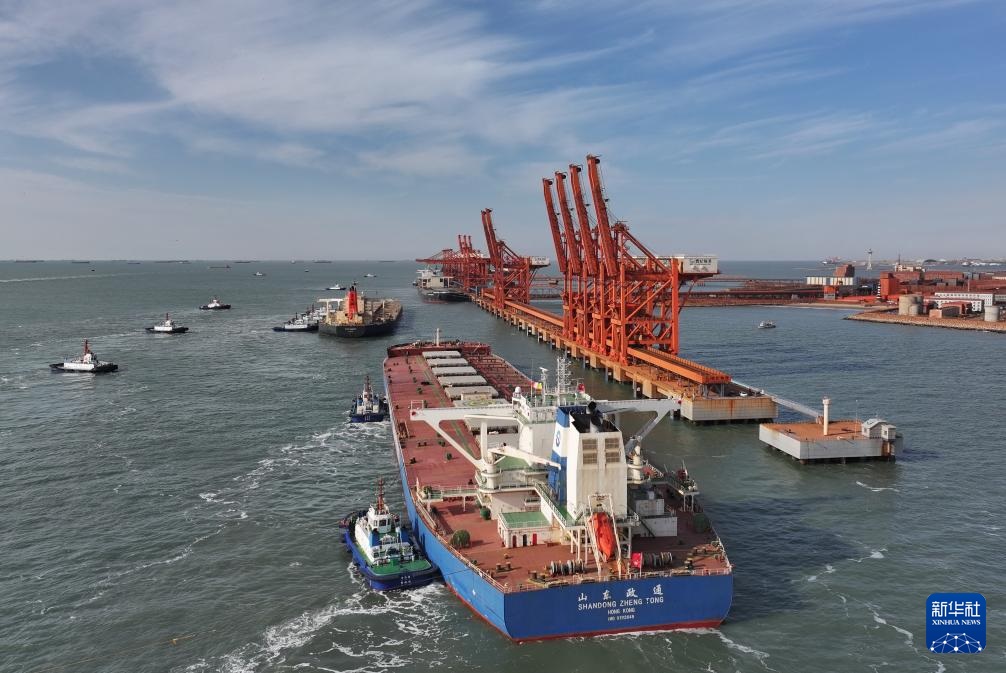 1月13日,两艘轮船在拖轮协助下向唐山港曹妃甸港区矿石码头靠泊(无人机照片)。新华社记者杨世尧摄