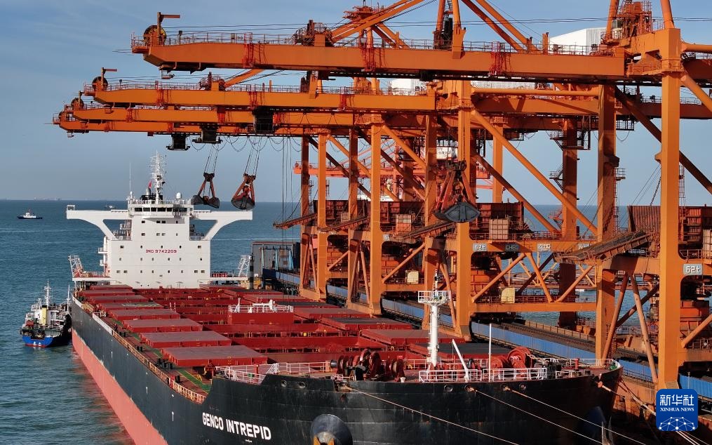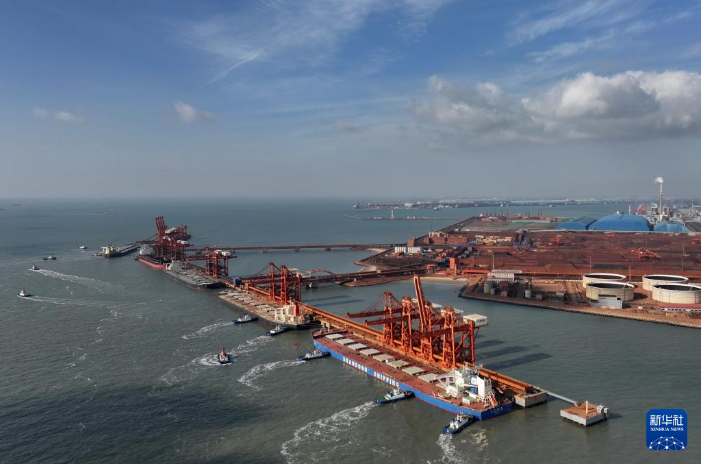 1月13日,靠泊在唐山港曹妃甸港区矿石码头的一艘轮船在卸载(无人机照片)。新华社记者杨世尧摄