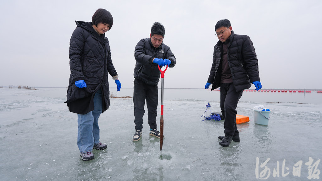 通往淀边的村路上,安新县生态环境局环境监测站站长刘冬梅和同事张冬生、朱健铭,喊上熟悉冰面环境的采蒲台村村民郭国堂,扛着冰钎、拎着采样器和监测设备,踏上白洋淀的冰面,开始了例行水质采样。