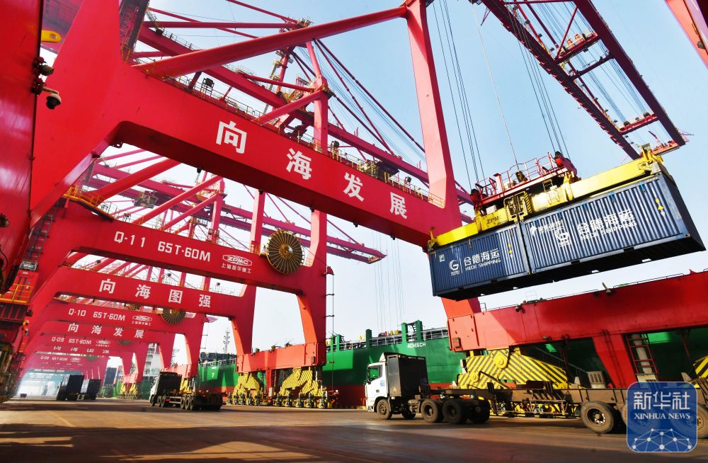 ↑ 1月15日,在黄骅港综合港区集装箱码头,岸桥设备在进行卸船作业。