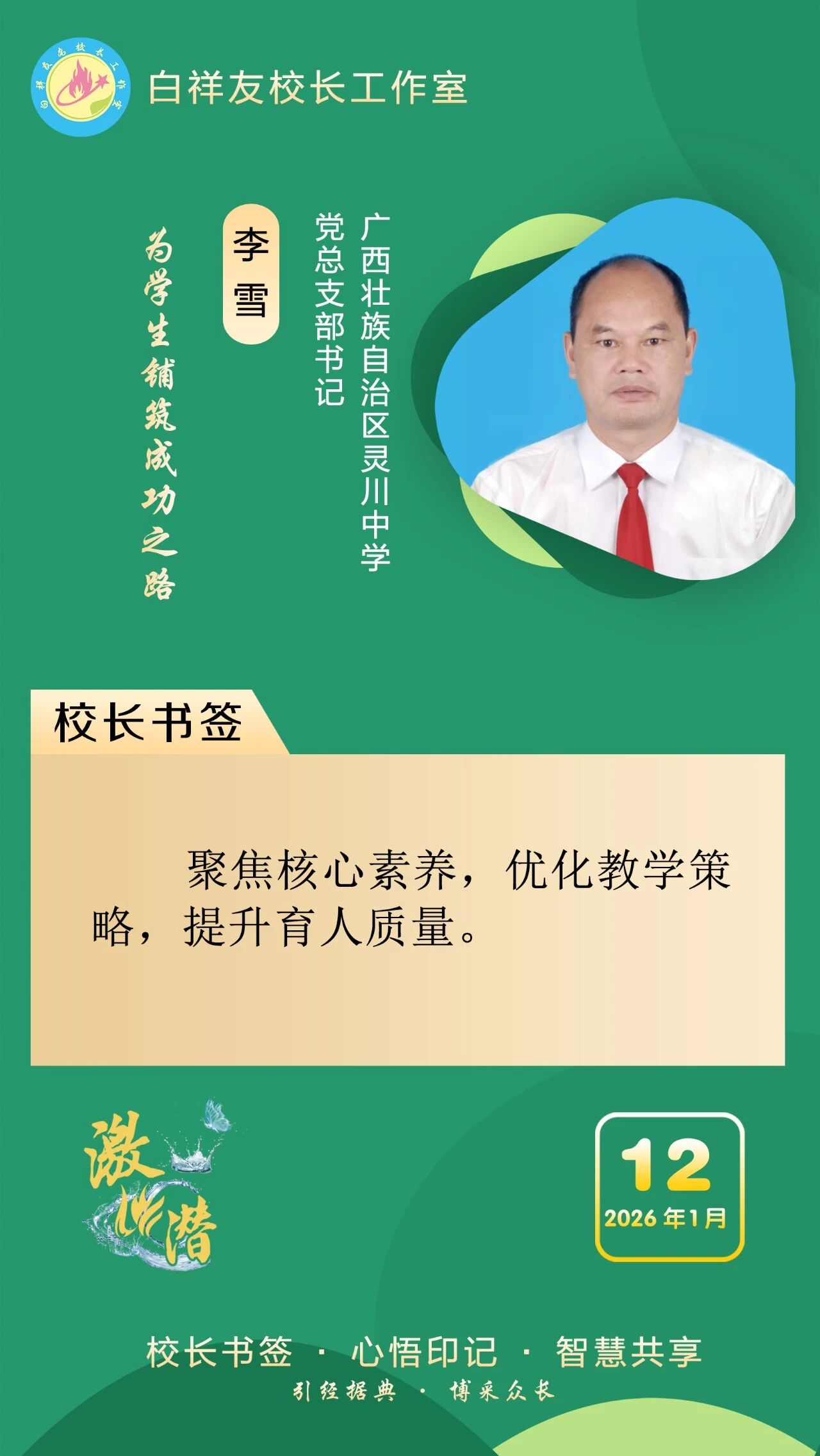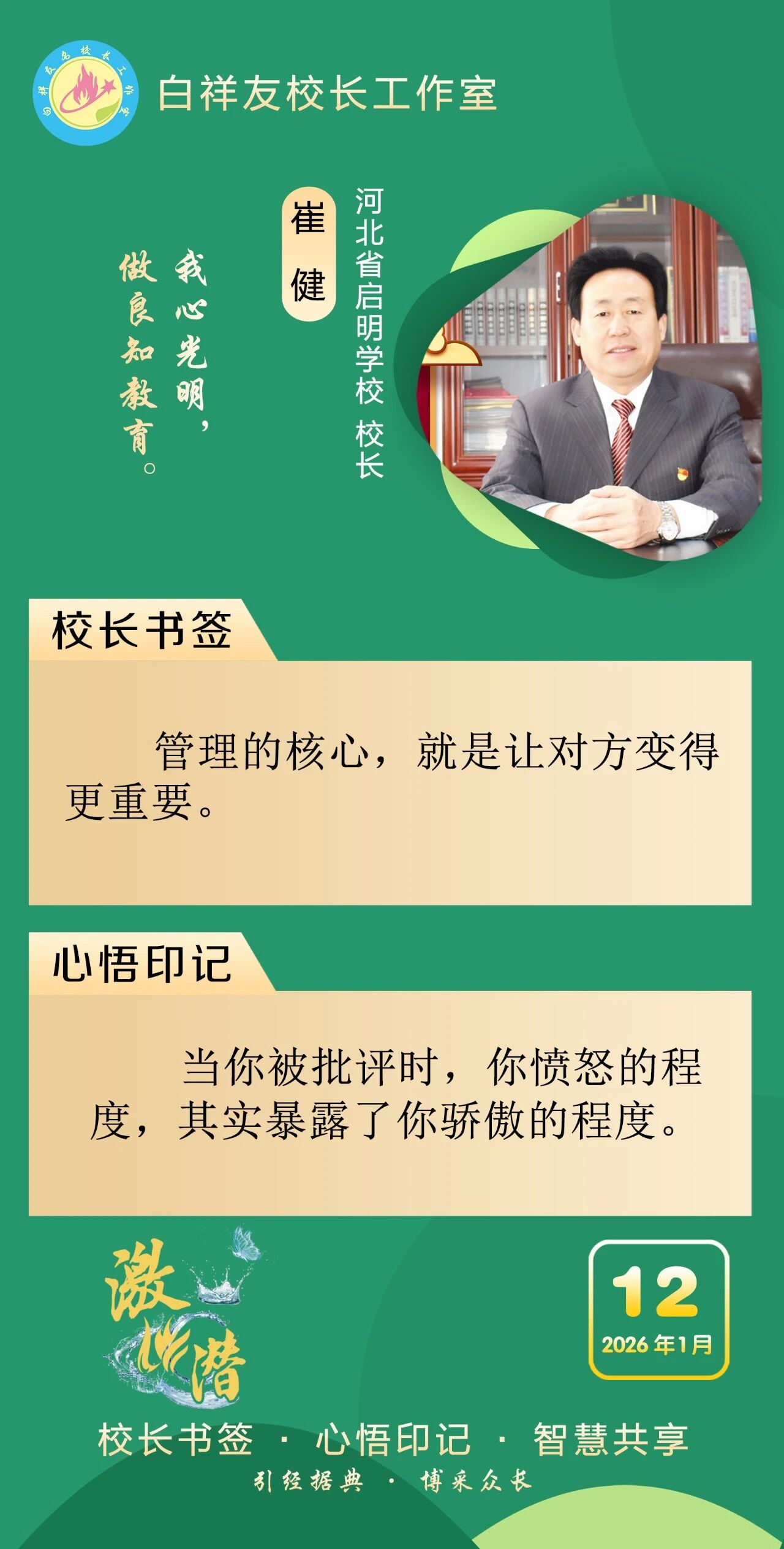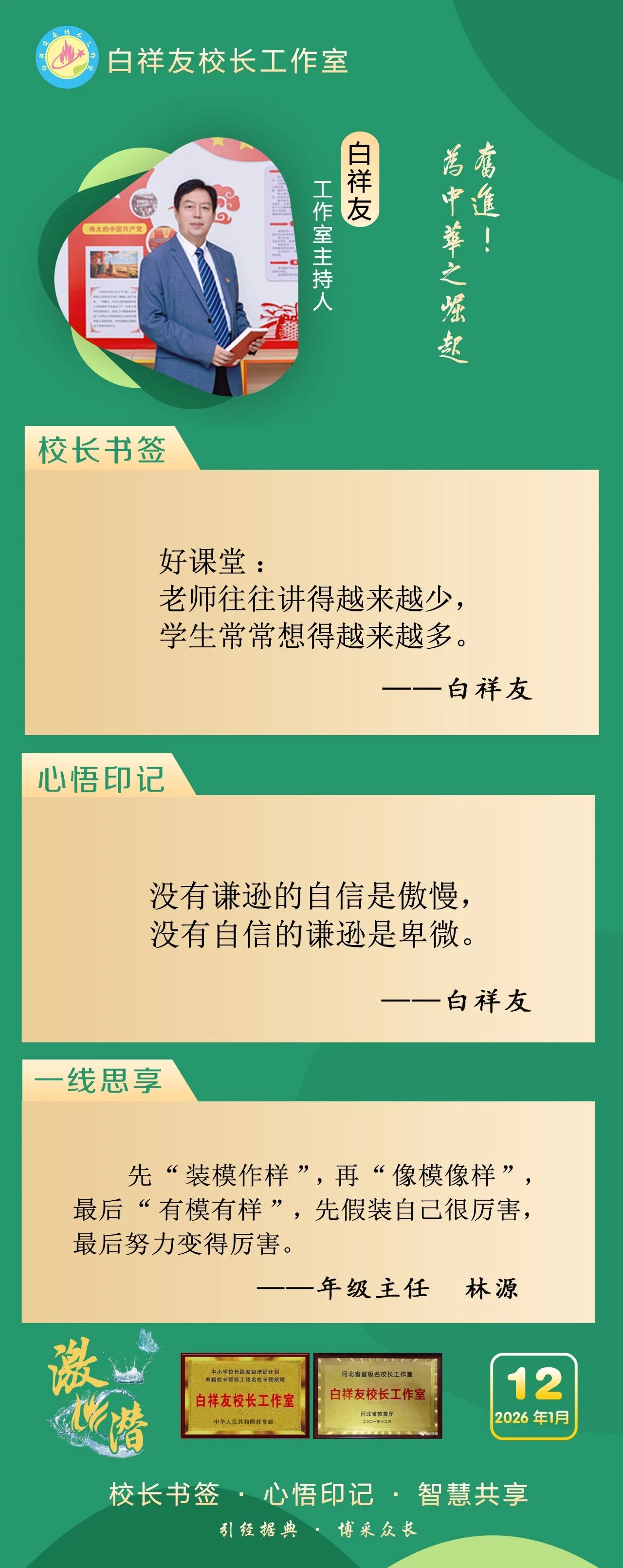 “白祥友校长工作室”成立于2019年4月,是教育部“国培计划”中小学名校长领航工程、河北省首批名校长工作室,目前省内外成员校59所。工作室坚持“资源共享、智慧共融、互助共赢”理念,已成为思想碰撞的交流场,资源共享的品牌站,成果展示的辐射源。 点赞 +1 微博 微信 我要评论 发布 相关推荐 衡水市名校长大讲堂在衡水十三中举办 教育部中小学校长培训办公室于维涛主任作专场报告 教育大观 01-19 白祥友校长工作室成员带队参观衡水十三中 教育大观 2024-05-22 “白祥友校长工作室”成员校石家庄十五中百余教师来衡水十三中参观 教育大观 2024-04-01 热门 一天 三天 一周 1 衡水全力加强麦田春管夯实夏粮丰收基础 2 守护安全 畅通消费 衡水市2026年“3·15国际消费者权益日”系列活动启动 3 气温回暖年货干果易霉变 衡水市人民医院消化内科医生提醒:出现这三种情况切勿食用 4 衡水市工商业联合会(总商会)第七次代表大会召开 5 河北衡水:湖城春景入画来 6 【新闻发布】衡水发布2025年消费维权“成绩单”——12315热线受理投诉按时办结率100% 7 武邑县电商人才培训为乡村振兴注入新动能 8 【弘扬诚信文化】衡水市桃城区数政局开展“诚信3·15 信用伴我行”主题宣传活动 9 气温回暖 衡水处处春意浓 10 【衡视频】书香遇手作 风铃寄温情 1 央媒省媒关注全国两会中的“衡水声音” 2 政策宣讲 岗位对接 衡水市开展“春风行动”招聘会暨“情暖三八 社保护航”主题宣传活动 3 瓜田“土专家” 共富“领头雁” ——记阜城县高级农艺师何国仓 4 阜城县企业数字化转型培训会赋能产业转型升级 5 衡水市开展“诚信3·15,信用伴我行”主题宣传活动 6 一场制造业的“数字春雨”——衡水市景县优化营商环境一线探访 7 白天上班,晚上学艺!桃城区青年文化夜校2026年第一期开始报名啦 8 书香润巾帼 悦读绽芳华 衡水市图书馆开展阅读活动庆“三八” 9 阜城霞口镇刘老人村百年梨园春管正当时 10 阜城县漫河镇:甜瓜春管忙 丰收底气足 1 《中华人民共和国献血法》首次修订——这些变化和每位献血者有关 2 衡水籍拳手靳金城泰国赛场连克强敌 斩获ABF金腰带挑战资格 3 麦粒“画”雷锋!阜城县霞口镇创新形式激活青少年思政课堂 4 喜迎新学期 安全伴成长——衡水市人民路小学开启新学期新篇章 5 “农疗基地+企业托举”助力衡水残疾人就业增收 6 恒为检验检测认证(河北)集团有限公司董事长王河山:助力衡水工程橡胶产业在国际舞台绽放光彩 7 3月1日至5日接待游客近4000人次 衡水雷锋馆迎来参观热潮 8 护航开学季 衡水市开展学校食堂食品安全风险隐患排查行动 9 安平春节文旅市场“热力足” 259场活动吸引近20万人次 10 武强县成功举办“探秘蒙牛工厂”主题研学活动 广告 广告 广告 24小时 1 传习录丨种下的是树苗,也是祖国的美好未来 2 拾光纪·用命运的泥巴种荷花,她把无声者的声音带到人民大会堂 3 同心绘就中国式现代化新图景(社论)——热烈祝贺全国政协十四届四次会议胜利闭幕 4 海报系列||早安衡水 5 【乡村行 看振兴】棚室轮作种植 果蔬四季“生金” ——看董师傅如何算好“增收账” 6 总书记的两会关切|好规划和执行力,习近平格外重视 7 壹视界·总书记两会“下团组”丨中国式现代化,每个人都是主角 8 习近平的两会时间丨总书记的两会之问 落地有回响 9 【河北代表委员议国是】凝聚共识实干担当 奋力推动高质量发展 10 河北代表委员热议树立和践行正确政绩观