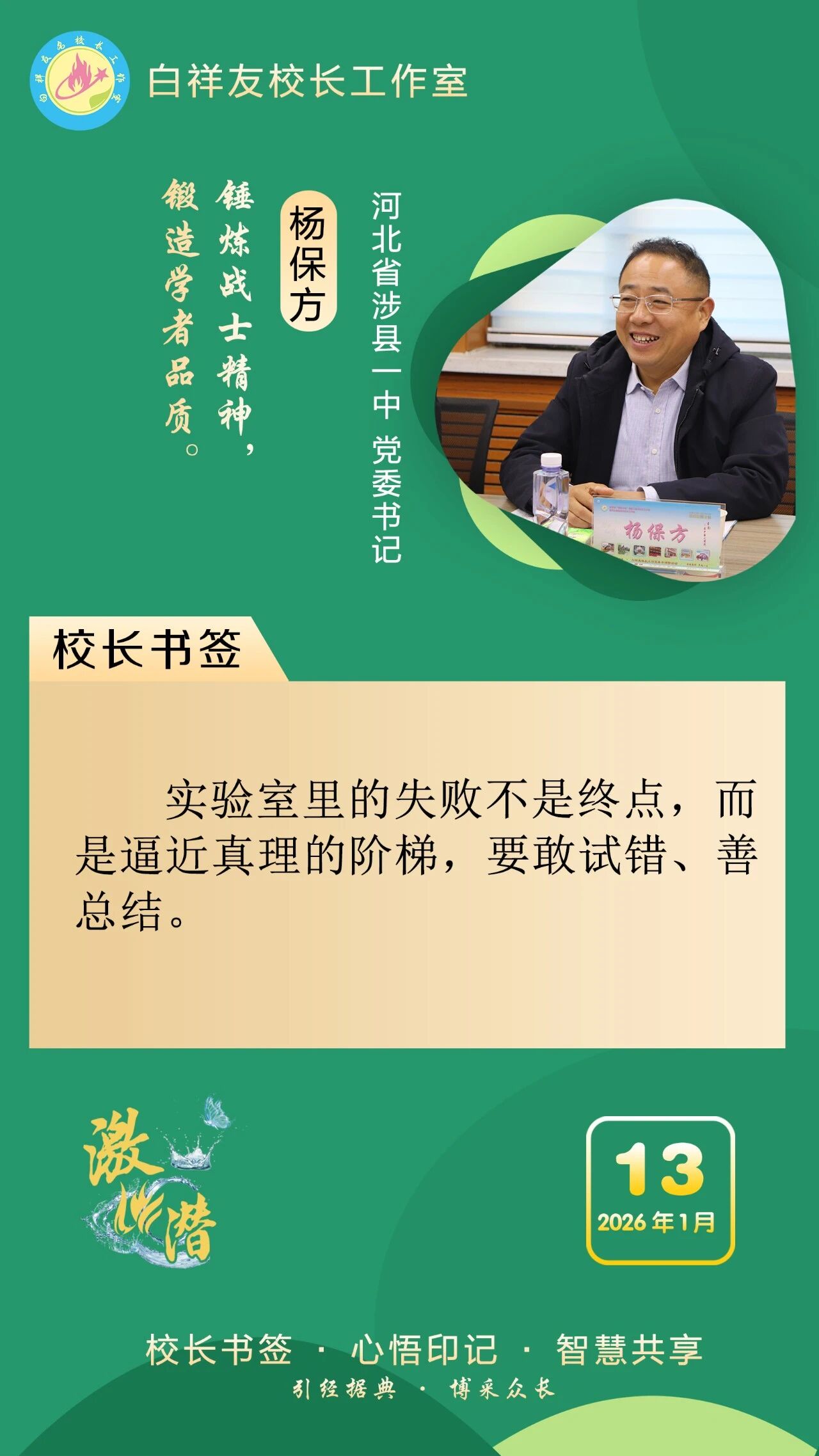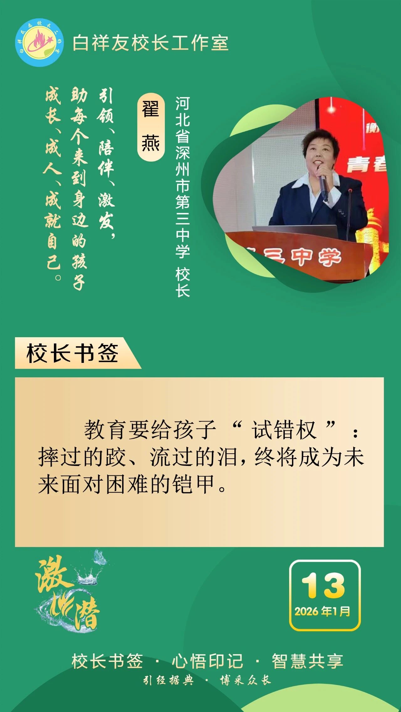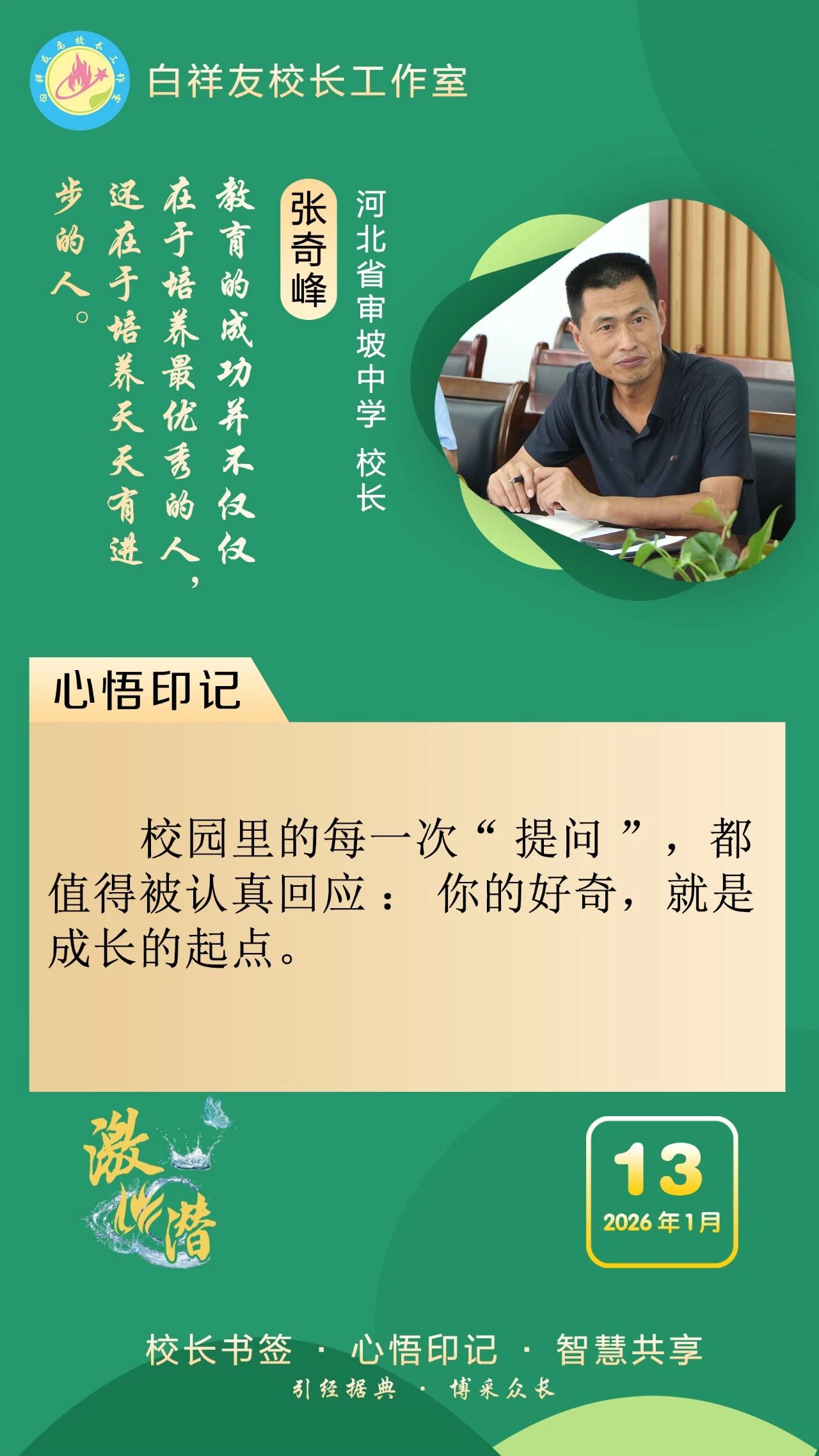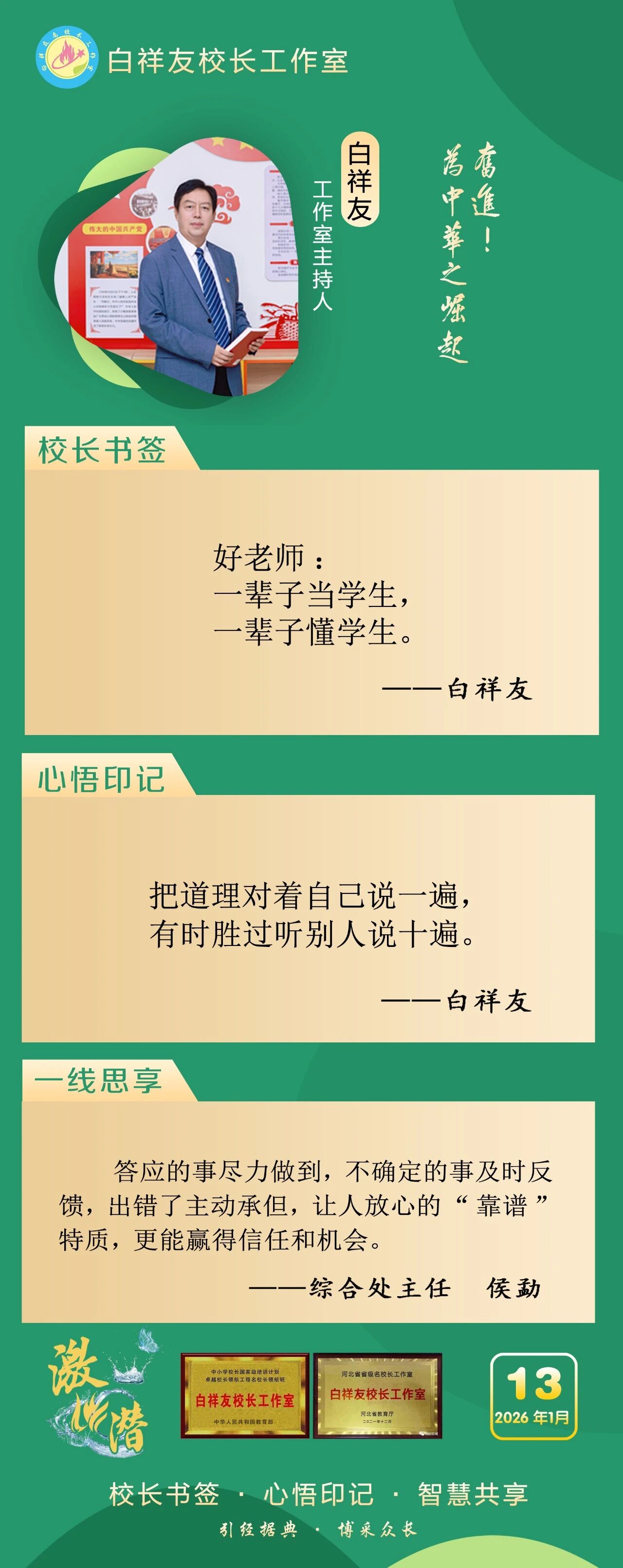 “白祥友校长工作室”成立于2019年4月,是教育部“国培计划”中小学名校长领航工程、河北省首批名校长工作室,目前省内外成员校59所。工作室坚持“资源共享、智慧共融、互助共赢”理念,已成为思想碰撞的交流场,资源共享的品牌站,成果展示的辐射源。 点赞 +1 微博 微信 我要评论 发布 相关推荐 衡水市名校长大讲堂在衡水十三中举办 教育部中小学校长培训办公室于维涛主任作专场报告 教育大观 01-19 白祥友校长工作室成员带队参观衡水十三中 教育大观 2024-05-22 “白祥友校长工作室”成员校石家庄十五中百余教师来衡水十三中参观 教育大观 2024-04-01 热门 一天 三天 一周 1 “河北五超”衡水赛区第二十六轮完赛 2 海报系列||早安衡水 3 看图学习·冰雪春天丨“人生能有几回搏” 总书记勉励冰雪健儿 4 白祥友名校长工作室 | 激潜教育探索随笔(第758期) 5 向美而行 乡村蝶变 ——衡水市绘就和美乡村新画卷 6 河北衡水:“红火过大年”文旅消费市集热闹开市 7 学习新语|焦裕禄精神一直是一盏明灯 8 白祥友名校长工作室 | 激潜教育探索随笔(第757期) 9 【新思想引领新征程】冰雪“冷资源” 活力“热引擎” 10 习言道|希望你们的生活像糖果一样甜甜美美 1 【新春走基层】非遗“老手艺”遇上“新匠人” ——武强姐弟年画雕刻直播“出圈”记 2 衡水移动:织密通信“保障网” 守护万家“团圆年” 3 春节期间衡水推出近200项文旅活动 4 故城:大棚香椿抢“鲜”上市 5 破局与生长 ——2025年十大亮点见证基础教育的衡中力量 6 一见·“冰雪大国”是怎么炼成的? 7 衡水市首个市属高速公路党群服务驿站挂牌启用 8 全省首笔!工行冀州支行3000万元“购建贷”赋能棉纺产业智能化升级 9 桃城机场护航 河北竞速队勇夺2025无人机竞速联赛佳绩 10 剪福字 贴窗花 武邑开展童心敬老活动传承美德 1 衡水武强:“小小蓝莓”结硕果 特色农业助农富 2 【回眸2025】潮涌湖城满目新——衡水2025年全面深化改革工作综述 3 衡水湖举办世界湿地日宣传活动 传递生态守护理念 4 衡水市武邑县开展“机械强农”行动破解农业生产难题 5 振翅向自由! “衡湖福雁”重归衡水湖 6 衡水武强:赶订单忙生产 金音乐器奏响新春“奋进曲” 7 春运启幕 衡水车务段全力守护旅客平安顺畅出行 8 马年春节临近 衡水市区年宵花热销 9 河北衡水:民俗画《丰收乐》再现农耕记忆 10 衡水桃城区:让低空经济“飞”出新高度 广告 广告 广告 24小时 1 学习进行时|让孩子们成长得更好 2 对总书记说说心里话丨向新向上 挺起中国制造业的脊梁 3 倪岳峰主持召开河北省委理论学习中心组学习会 4 长图·2025年河北固定资产投资增速何以跑进全国前三①丨抢抓机遇,“两重”“两新”政策持续显效 5 张家口有故事丨万里长城第一门,雄峙塞北阅千年 6 新春走基层·看见雄安丨白洋淀站春意浓 温暖旅客回家路 7 新春走基层 | 我在-35℃的坝上“追光” 8 长城视频 | 北庄党员的幸福接力 9 答卷2025|织路成网 赋能未来——张家口交通高质量发展再提速 10 这是一份沉甸甸的高质量发展答卷