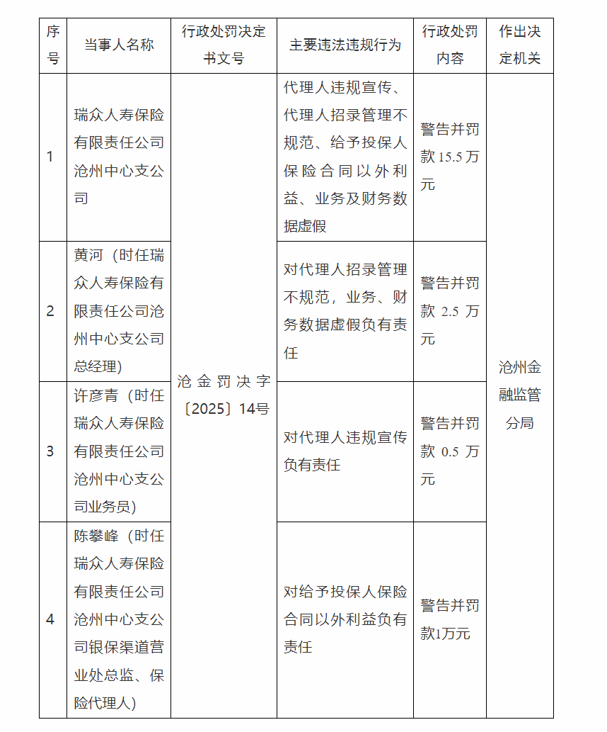 近期,瑞众人寿保险有限责任公司沧州中心支公司在经营过程中,暴露出诸多严重违规问题,遭到沧州金融监管分局的严厉惩处。