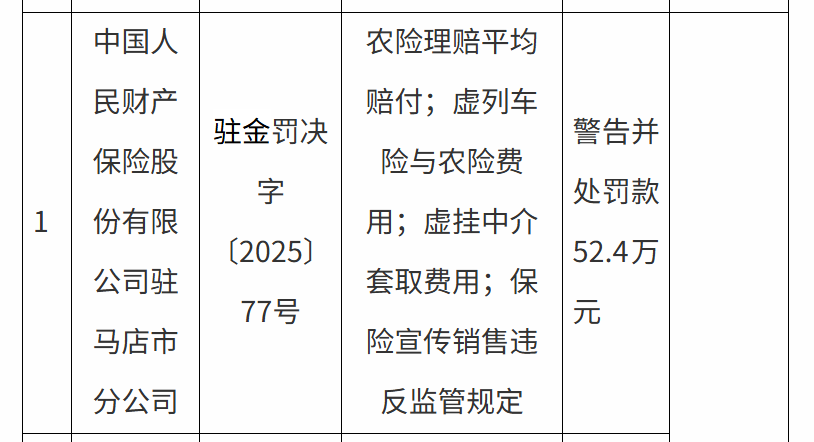 2026年1月12日,国家金融监督管理总局驻马店监管分局公布了一张人保财险的罚单。因农险理赔平均赔付;虚列车险与农险费用;虚挂中介套取费用;保险宣传销售违反监管规定主要违法违规行为,中国人民财产保险股份有限公司驻马店市分公司被警告并处罚款52.4万元。